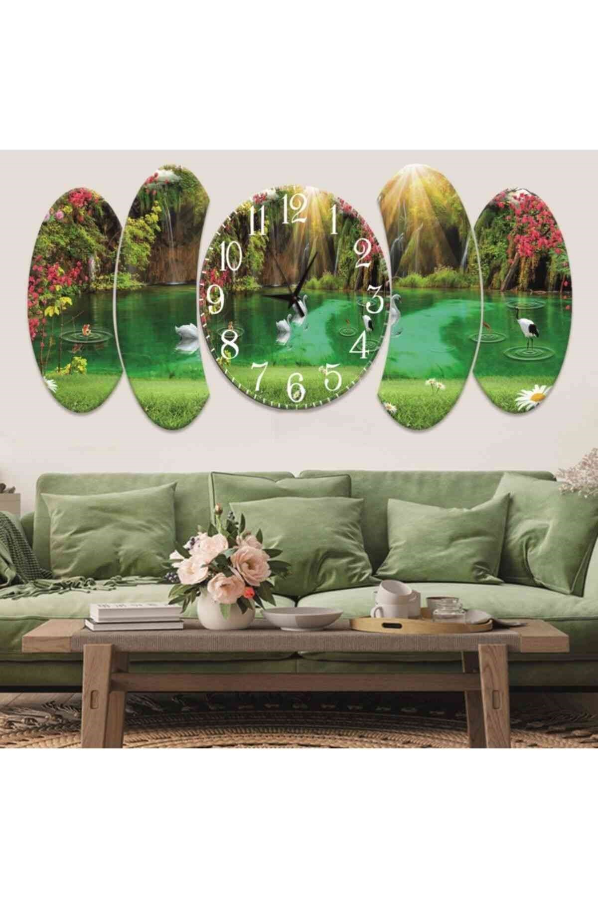 5 Parça Doğa Tasarım Saatli Mdf Tablo