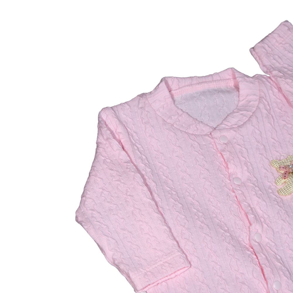 Kabartmalı kumaş yapısı ve zarif ayıcık fiyonk detayıyla dikkat çeken bu pembe bebek tulumu, hem konfor hem şıklık arayan ebeveynler için tasarlandı. %100 pamuktan üretilmiş kumaşı ile bebeğinizin narin cildine tam uyum sağlar. Tam boy çıtçıtları sayesinde kolay giydirilir, alt kısmı da kapalı olduğundan ayakları sıcak tutar. Evde, dışarıda veya özel günlerde gönül rahatlığıyla kullanılabilir.