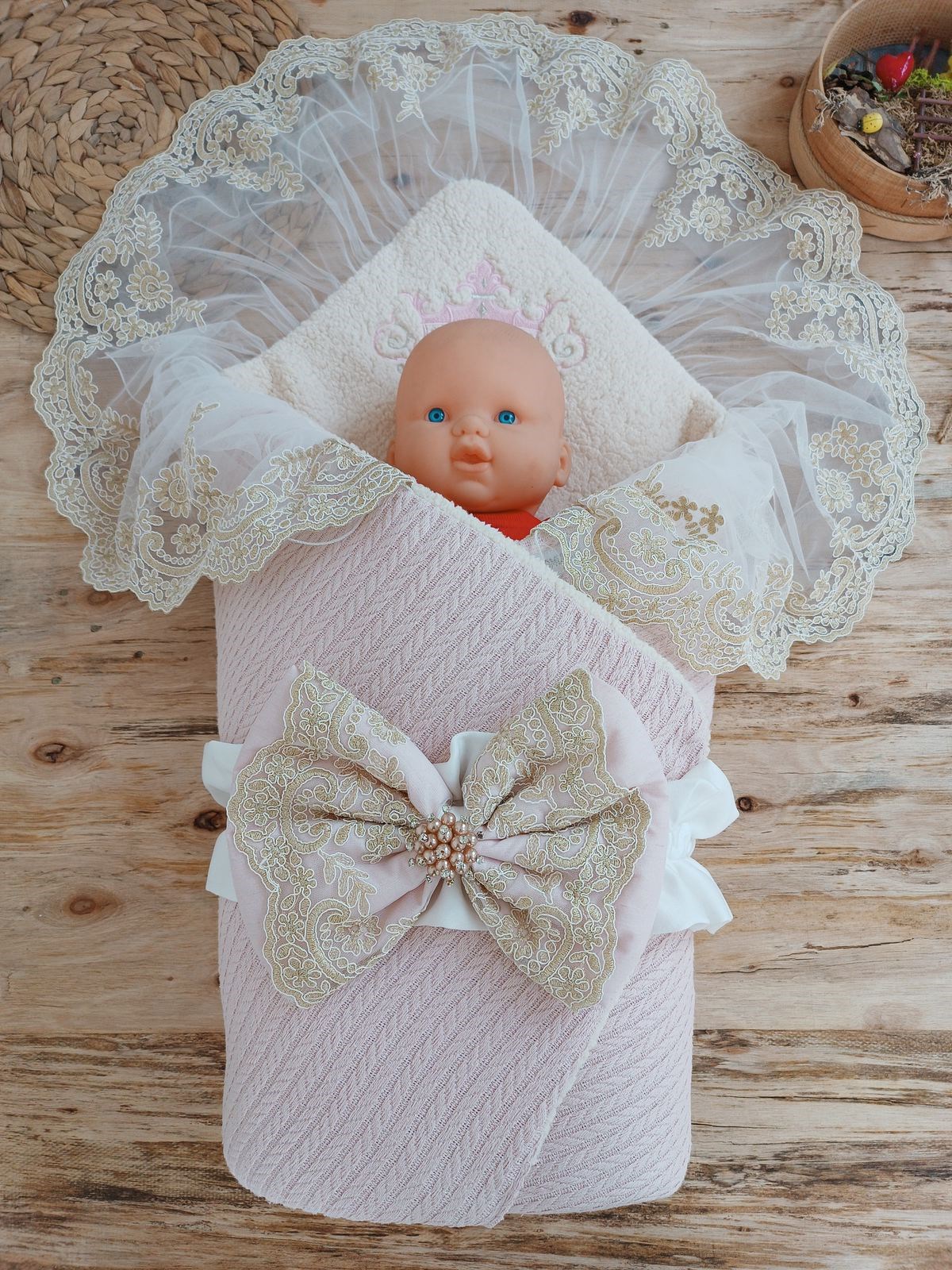 Yenidoğan Kuzulu Taç Nakış Güpürlü Fiyonklu Duvaklı Prizma Taş Unisex Kundak Bebek Battaniyesi