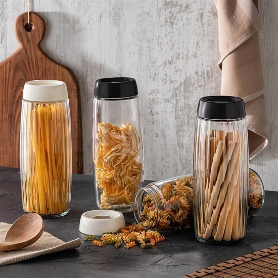 262x110x110 Zarif ve sade bir tasarıma sahip olan cam kavanoz kuru gıda, atıştırmalık, turşu, salça, un, hamur işi saklamak için idealdir.Bulaşık makinesine girebilir.Gövde cam olduğu dondurucuya girmemesi önerilir.