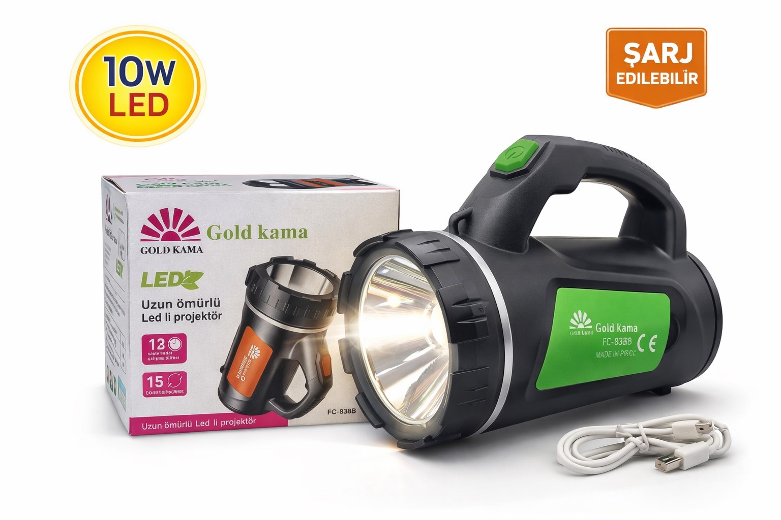 Gold Kama LED Şarjlı El Feneri FC-838B 10W Uzun Ömürlü Taşınabilir Projektör Fener