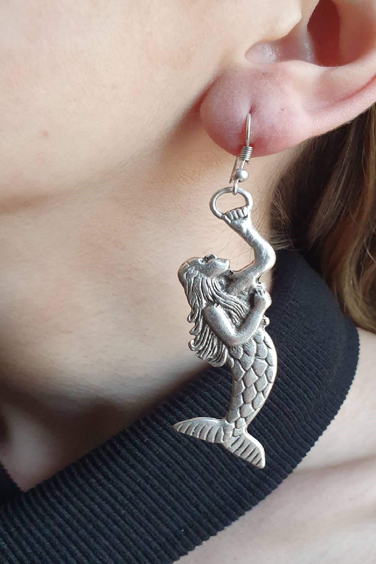 Gümüş Kaplama Antik Deniz Kızı Desenli Sallantılı Küpe Ürün metal gümüş kaplama ve çelikten üretilmiştir.Küpe 8 cm dir. Gümüş kaplama antik küpee ile şıklığınız tamamlayarak,özgür ruhunuzu yansıtın. Ürünü kimyasal maddelerden uzak tutunuz ve üzerine (parfüm,deodarant vs.) Direkt temasından kaçınınız.