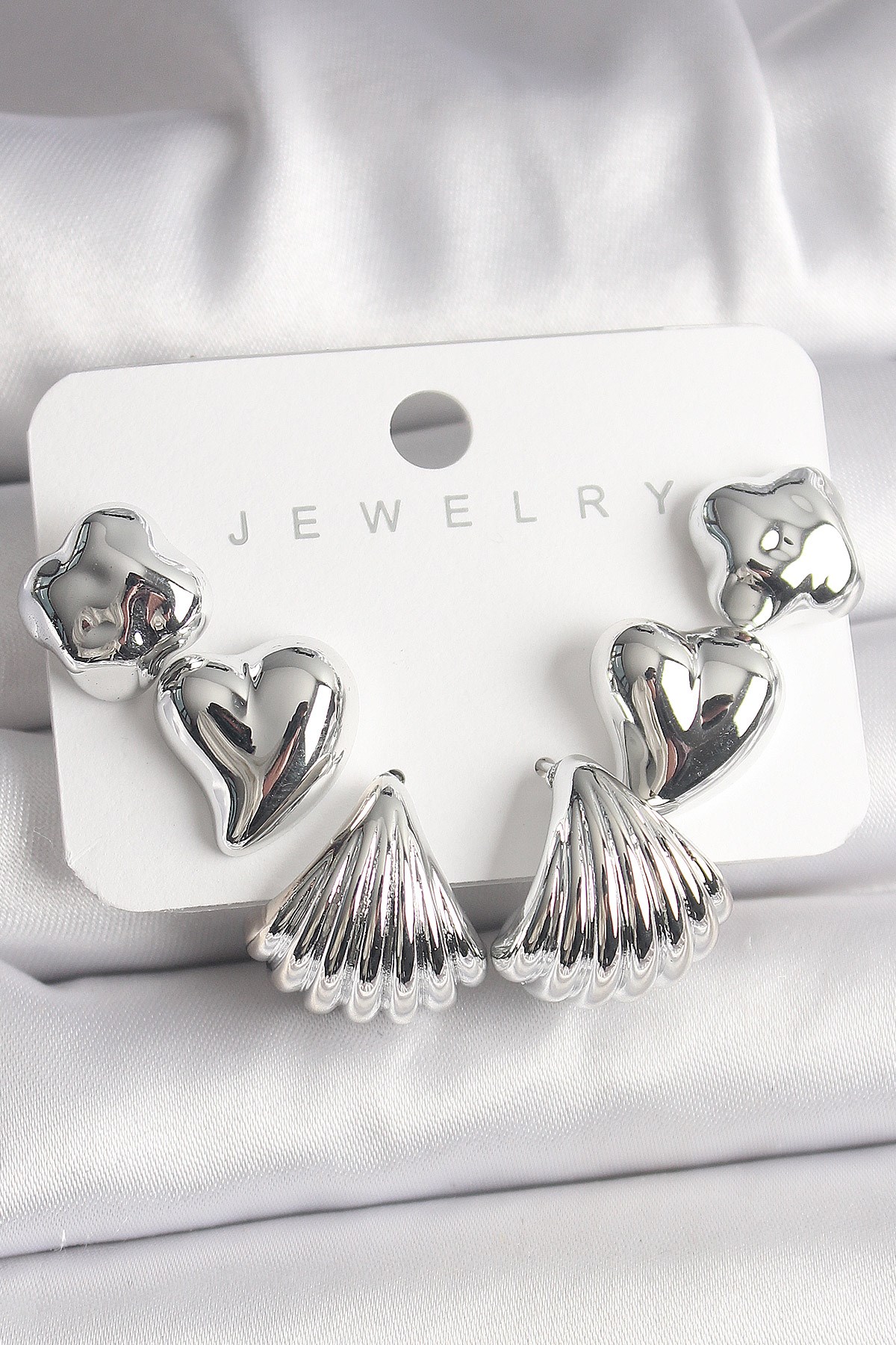 Gümüş Renk Yonca Kalp Deniz Kabuğu Figür CCB Kadın Küpe Seti