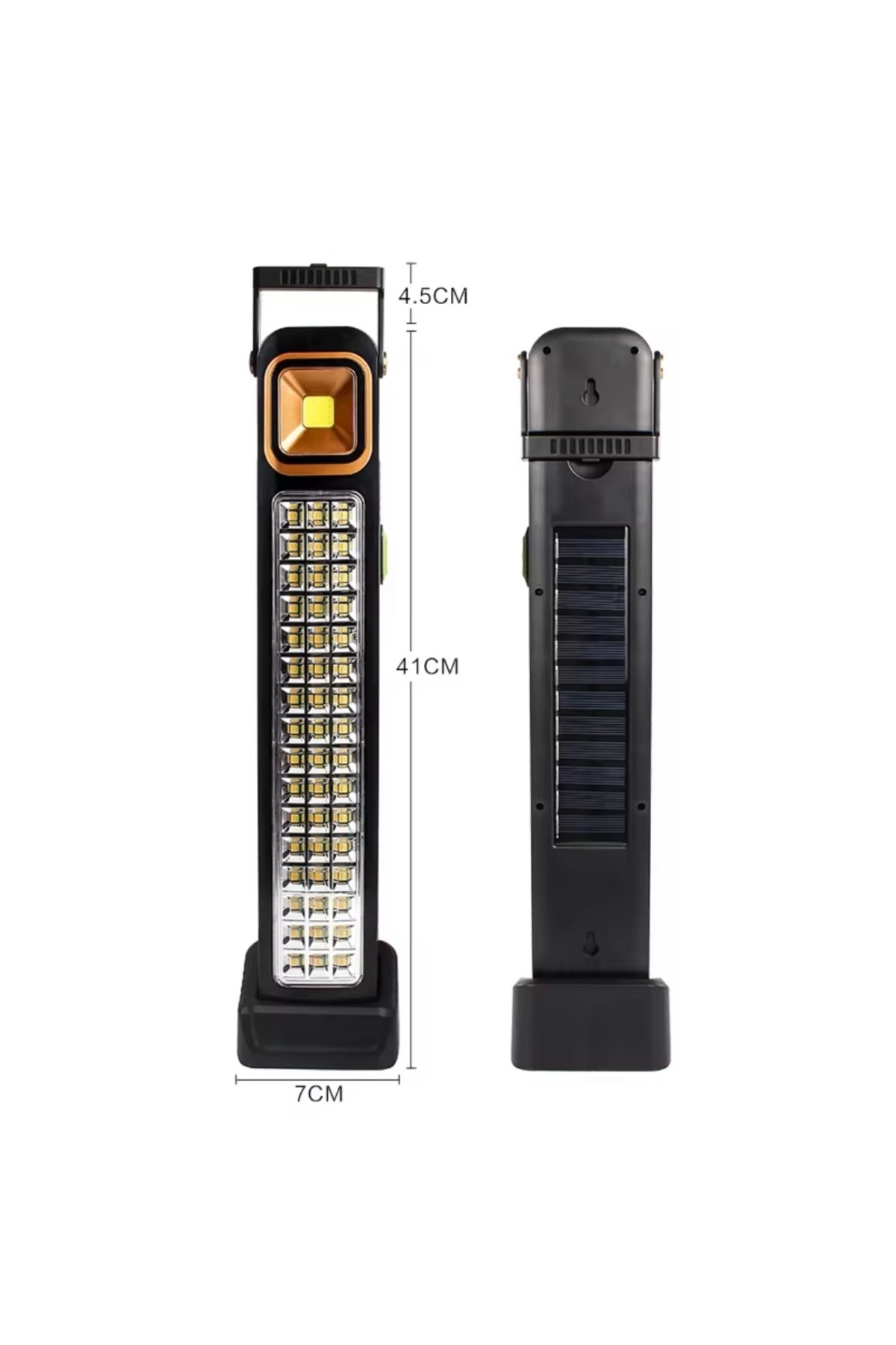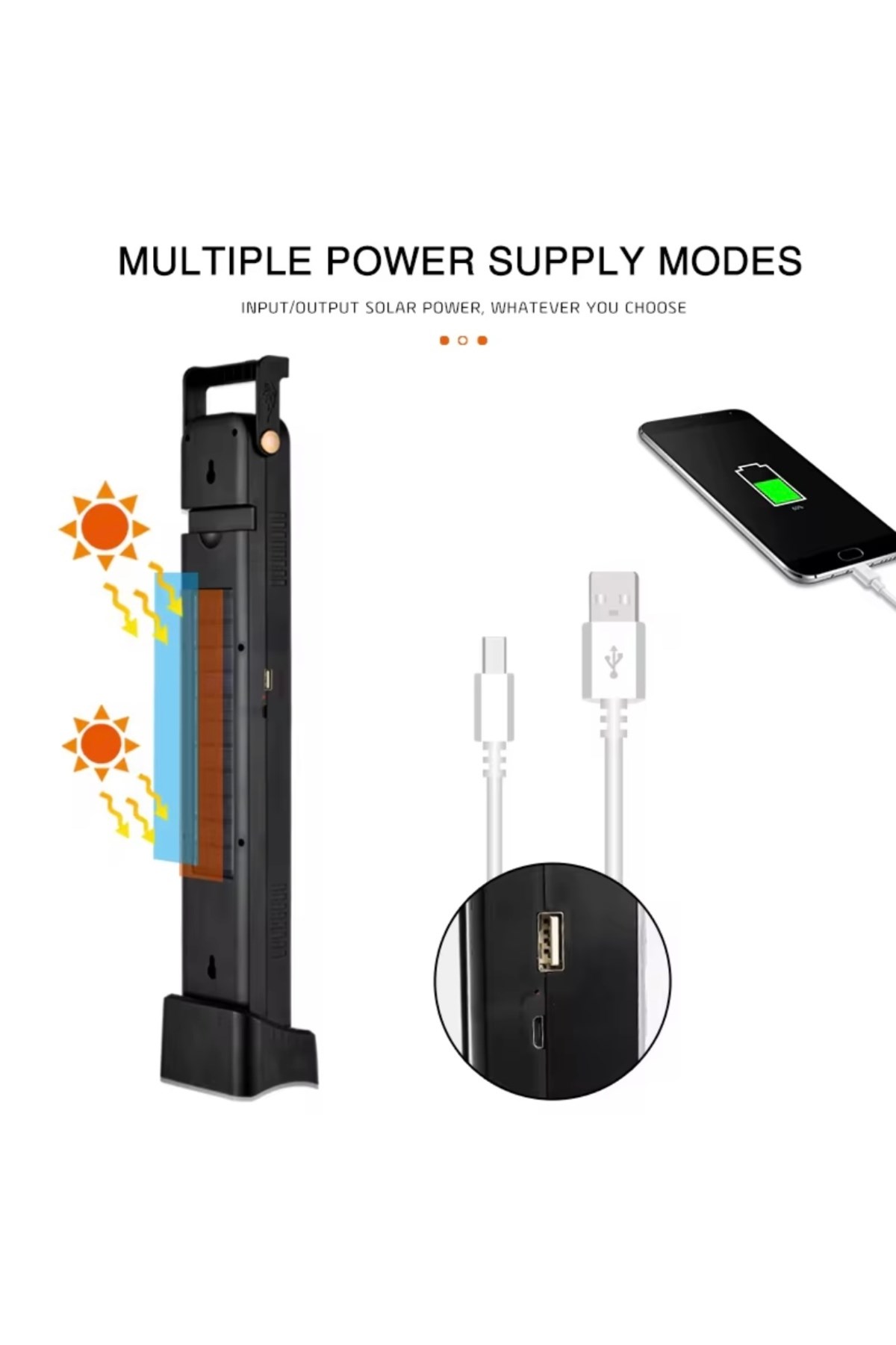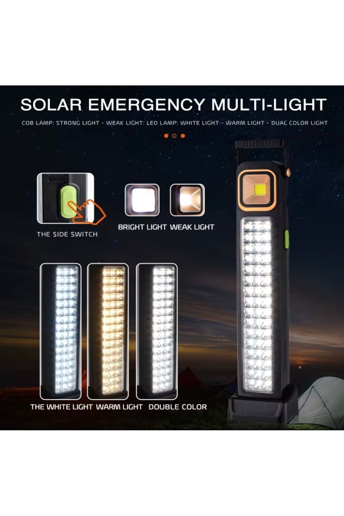Bu çok yönlü güneş enerjili acil durum ışığı ile her duruma hazırlıklı olun! İster kamp yapıyor, ister elektrik kesintisi yaşıyor olun, bu fener size her zaman güvenilir aydınlatma ve şarj imkanı sunar.; Temel Özellikler: * Çoklu Güç Kaynağı Modları: Güneş enerjisi ile şarj olabilme veya USB kablosuyla (Type-C ve USB-A çıkışları) harici cihazlarınızı şarj edebilme özelliği sayesinde asla elektriksiz kalmazsınız.; * Çok Yönlü Aydınlatma Seçenekleri: * COB Lamba: Güçlü ve zayıf ışık seçenekleri ile geniş alan aydınlatması sağlar.; * LED Lamba: Beyaz ışık, sıcak ışık ve çift renkli ışık modları ile farklı atmosferler ve ihtiyaçlar için idealdir.; * Kullanım Kolaylığı: Yan taraftaki pratik anahtar ile ışık modları arasında kolayca geçiş yapabilirsiniz.; * Taşınabilir ve Dayanıklı Tasarım: Sağlam yapısı sayesinde dış mekan kullanımı ve acil durumlar için uygundur.; Bu güneş enerjili acil durum ışığı, eviniz, kamp gezileriniz, araç bakımı veya herhangi bir elektrik kesintisi anı için vazgeçilmez bir yardımcıdır.; Hemen şimdi edinin ve karanlıkta kalmayın!