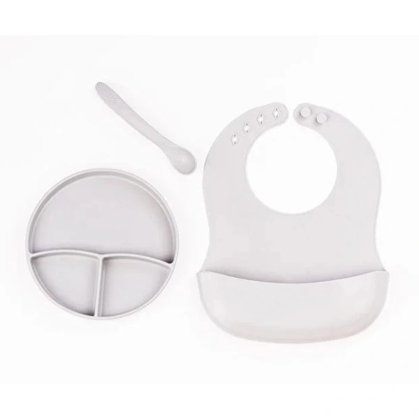 Gri 3’lü Silikon Yemek Seti – Önlük + Diş Kaşıyıcılı Kaşık + Vakumlu Tabak