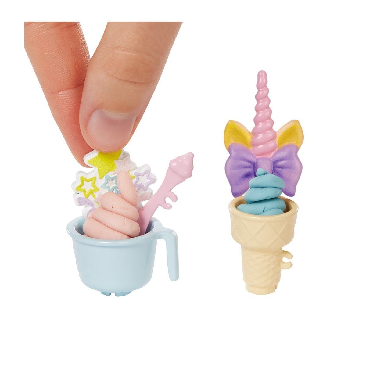 Oyun seti; Barbie®, dondurma standı, 2 renkte oyun hamuru, 2 kase, 2 külah, 3 dekoratif dondurma süsü, 2 kaşık, külahlık ve kasa içerir.