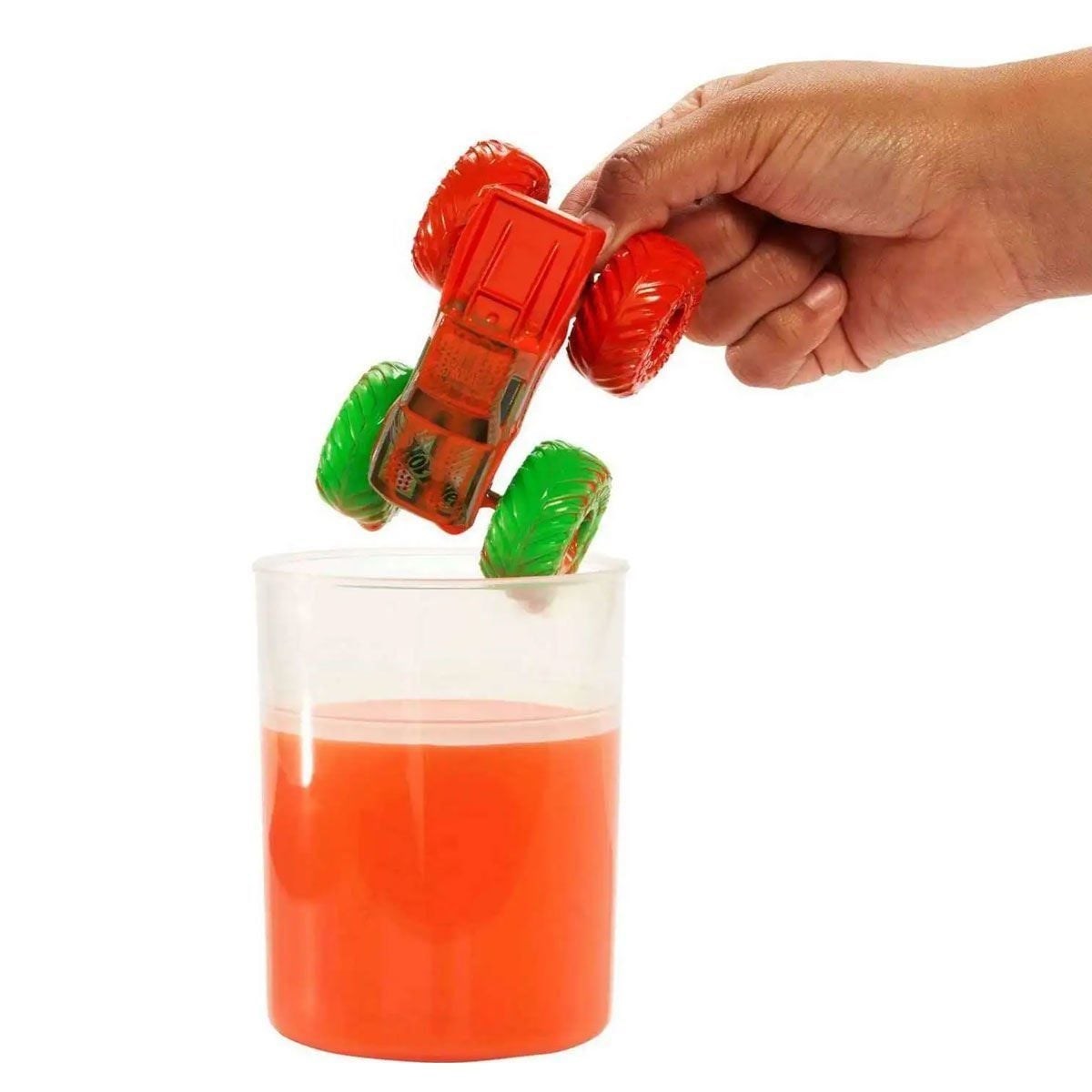 İlk kez renk değiştirirken hazneyi suyla doldurup arabayı içine yerleştirin ve suyun rengi değişene kadar arabayı suyun içinde hareket ettirin. Ardından arabayı çıkarıp Monster Truck aracının muhteşem süslemelerini keşfedin.
