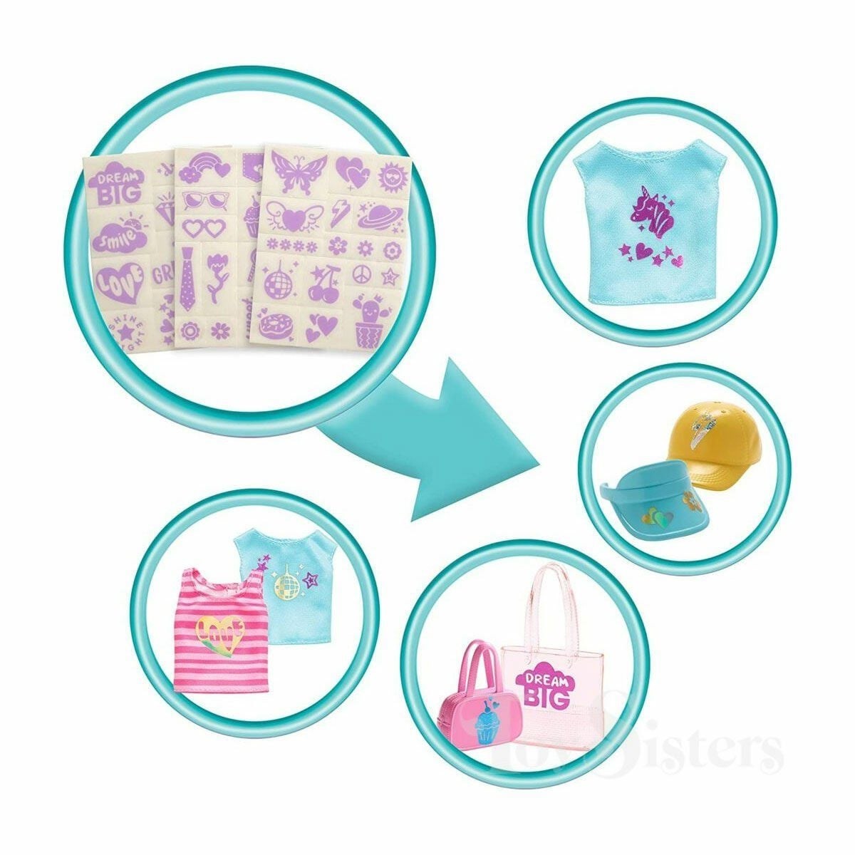 Başka bir tarzda yeniden kullanmak için çıkartmayı soyun -- sette 2 üst, 2 şapka ve 3 çanta, ayrıca ikonik resimler içeren 3 çıkartma sayfası ve 2 ışıltılı desen dahil 5 folyo yaprak bulunur!