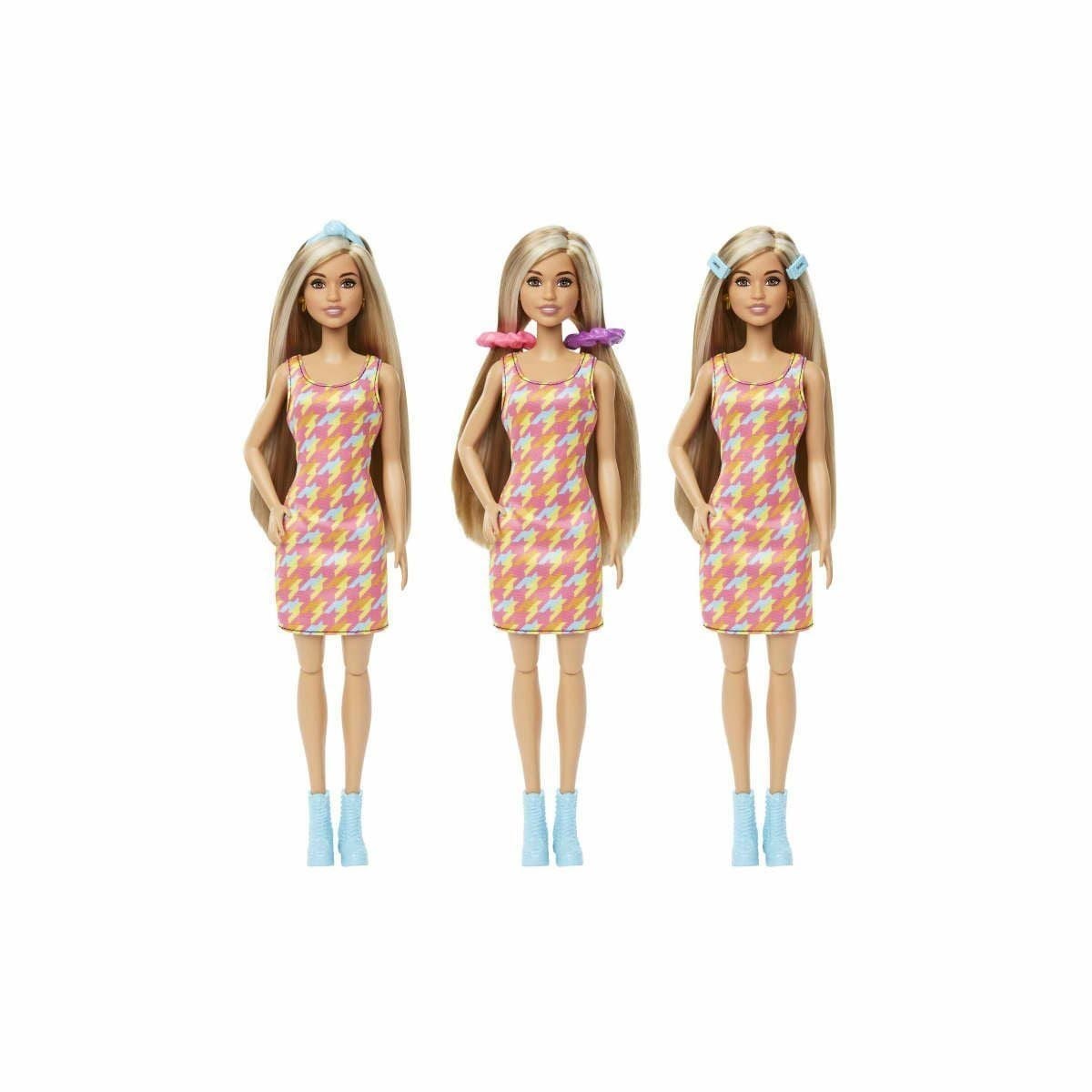 Barbie, renkli effetto cambia ile 15 cm boyunda bir şapkaya sahiptir. Renkli bir abito ile damgalanmış pied-de-poule ve mavi stivaletti!