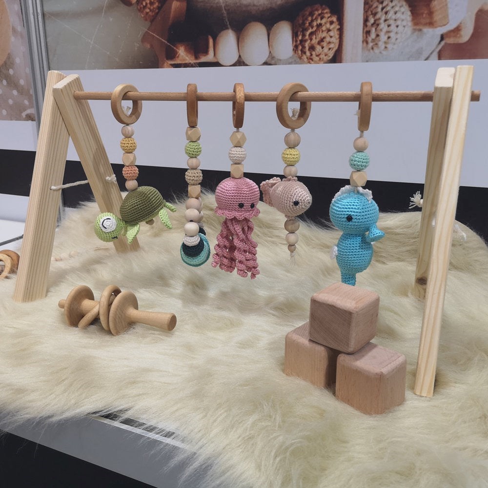 Ahşap Oyun Alanını, organik ahşap halkalar kullanarak amigurumi oyuncaklarla çocuğunuza eğlenceli bir alan yaratabilirsiniz. Kolayca çıkarılabildiğinden farklı farklı oyuncaklar takıp çıkarabilirsiniz.