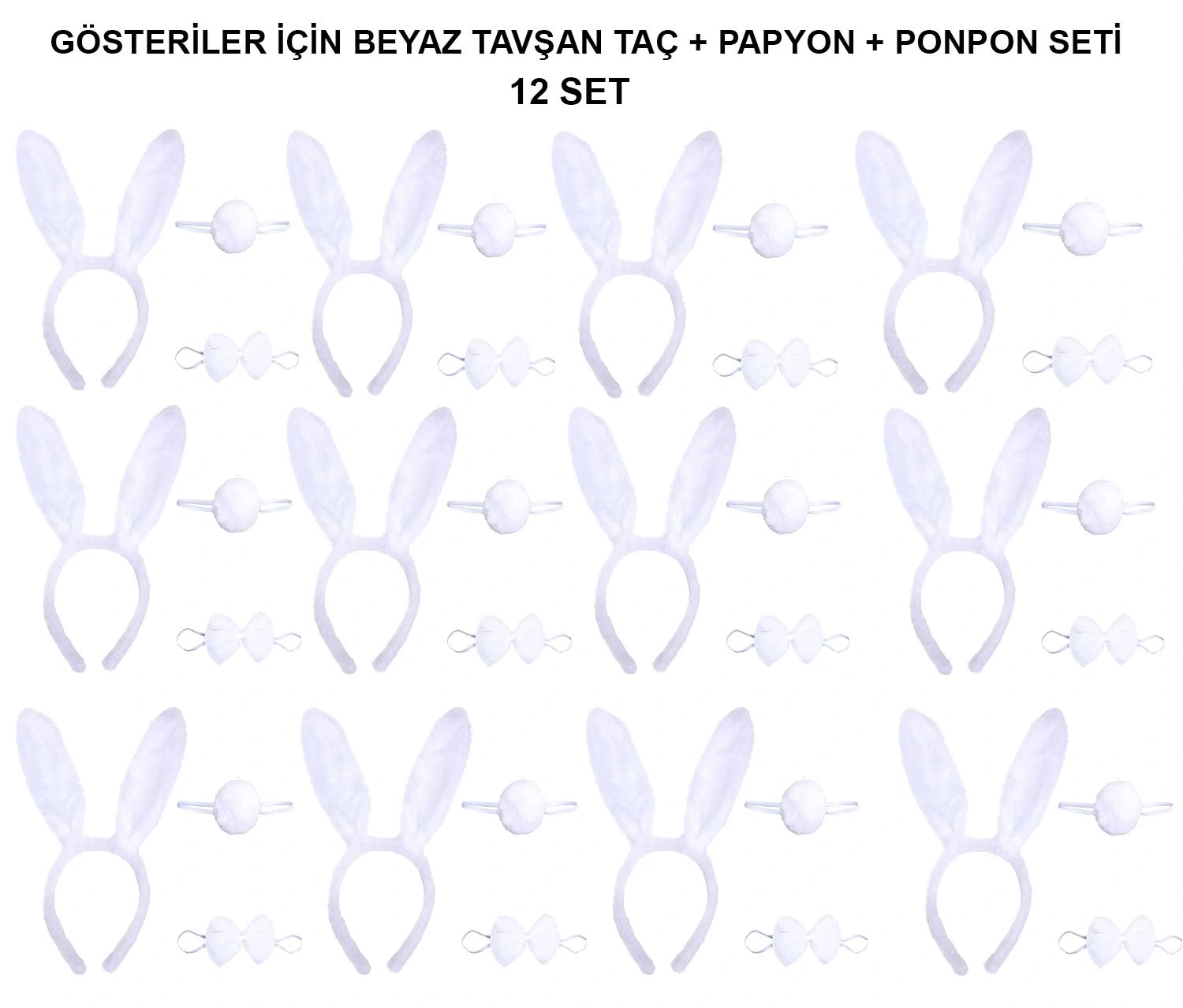 Beyaz Tavşan Kostüm Seti – Taç, Papyon, Kuyruk (12’li Paket)