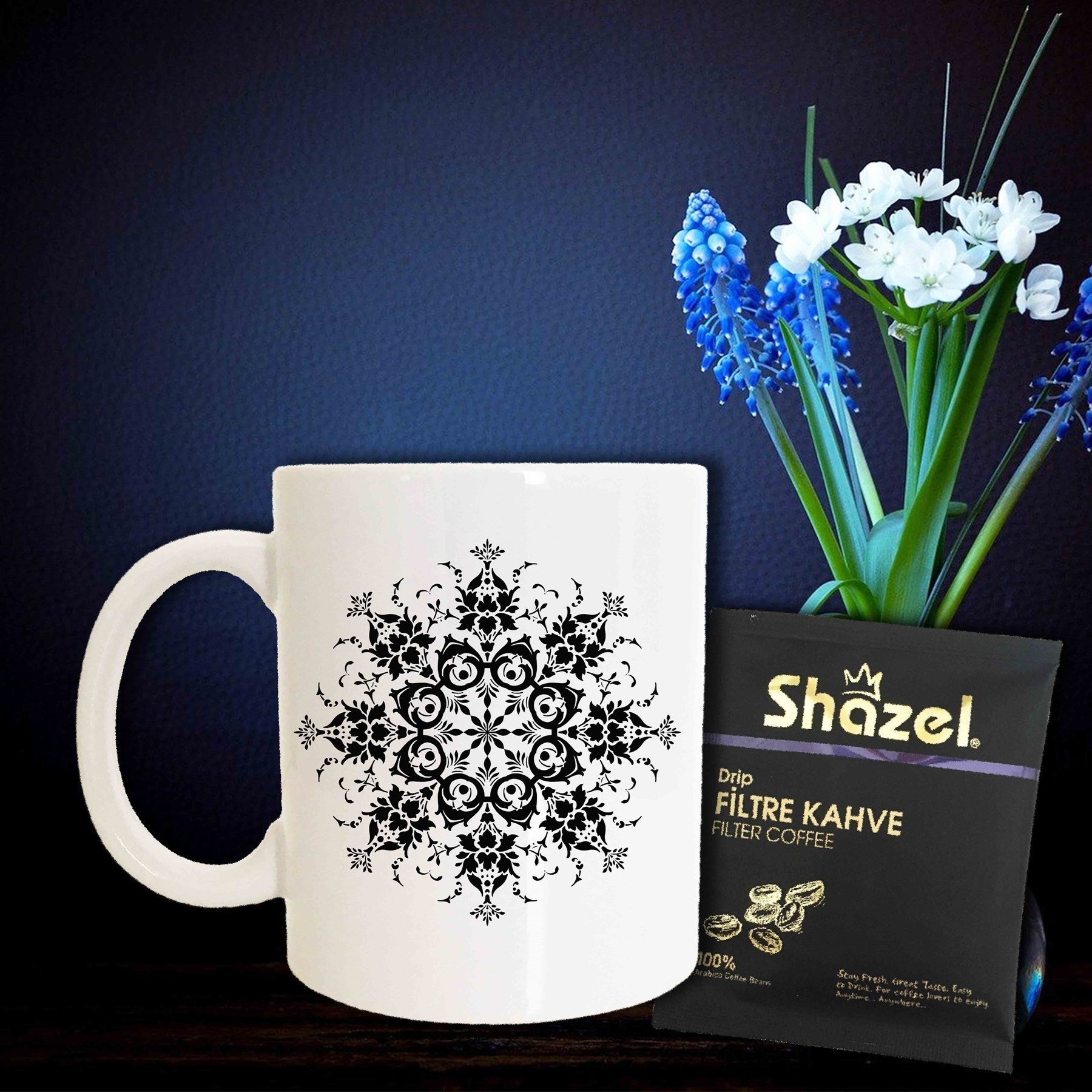 Siyah Beyaz Mandala Desenli Porselen Kupa Bardak