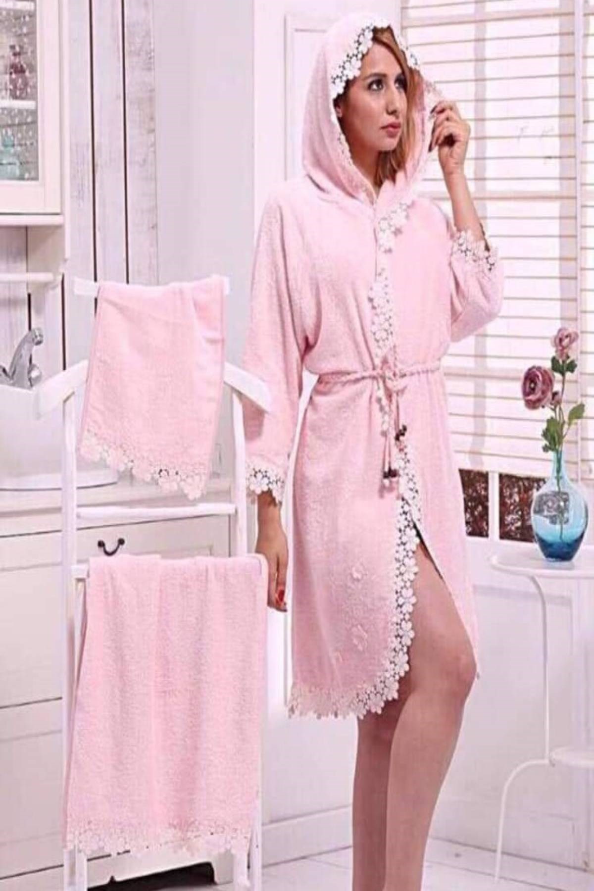 Just Home Fransız Dantelli Üçlü Kapşonlu Bayan Bornoz Seti Cottony