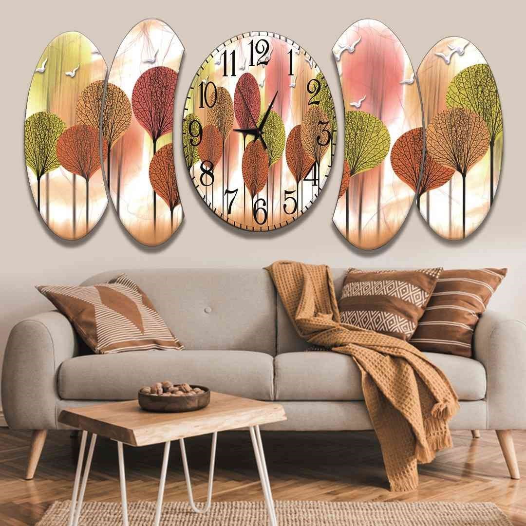 Evimona 5 Parça İllüstrasyon Yaprak Tasarım Saatli Mdf Tablo