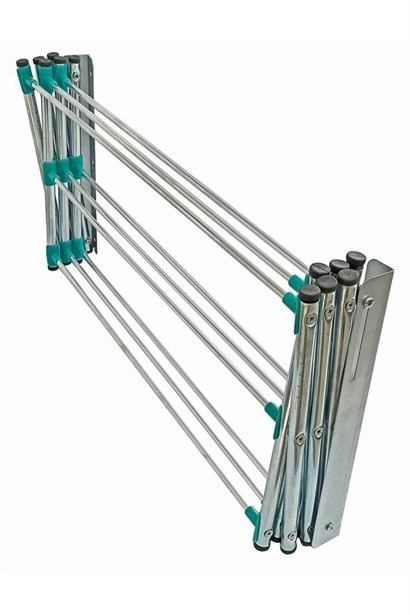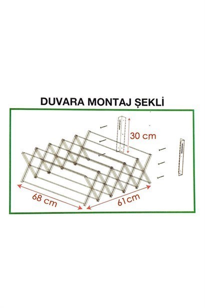Akordiyon Duvar Montajlı Çamaşır Askılığı Akordiyon yapısı sayesinde kullanılmadığında fazla yer kaplamayacak şekilde kapanabilir Balkon, banyo veya petek üstüne duvara montajlanabilir Montaj için dübel ve vidaları mevcuttur 9adet çamaşır asma çubuğu Ölçüler: En: 68cm / Uzunluk: 61cm