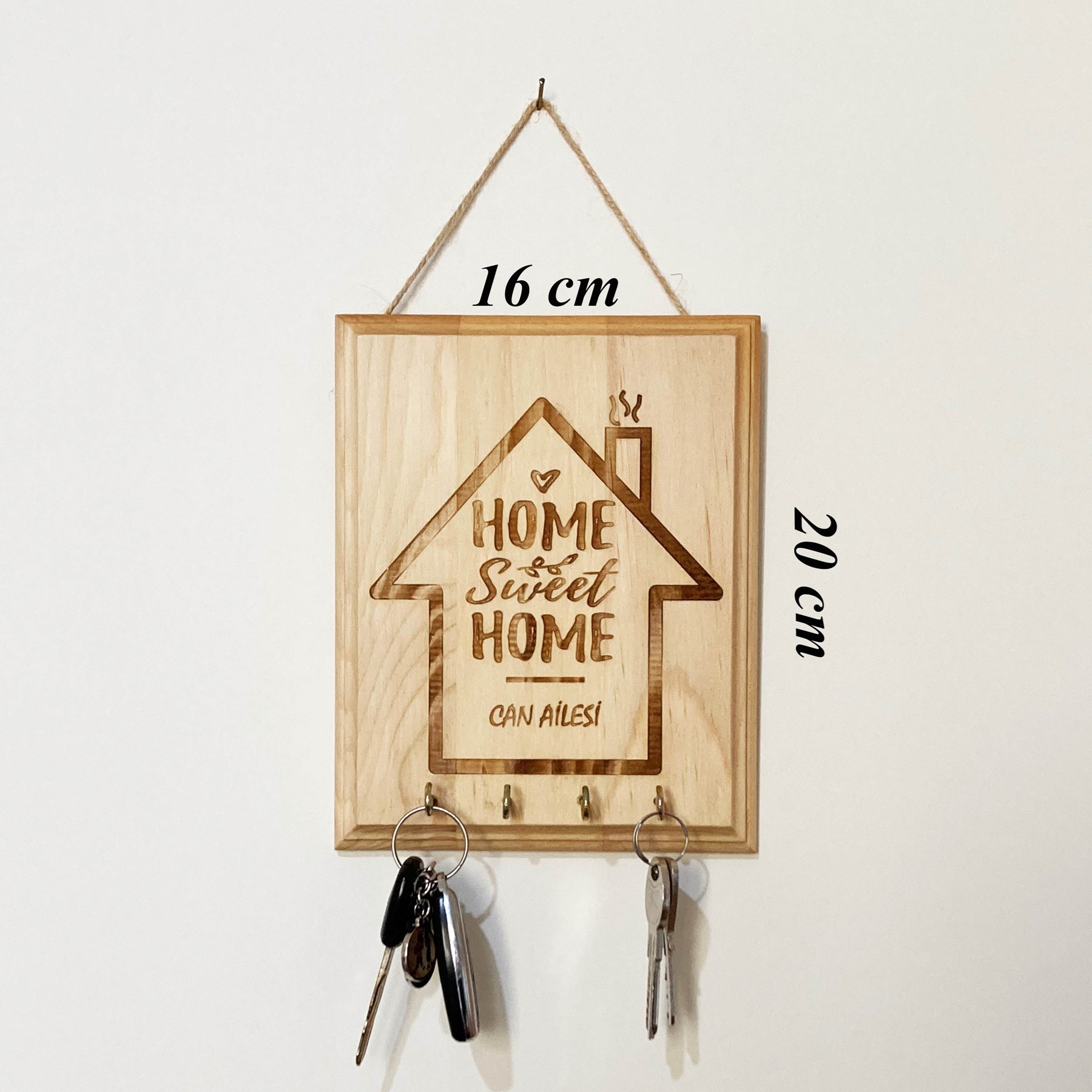 ÜrünAçıklaması; Duvar anahtarlığı huş ağacı malzemesinden yapılmıştır. ÜzerineLazer kazıma uygulanmıştır. Dört adet anahtar asma yeri vardır. Ürün ölçüsü20x16x2 cm dir.