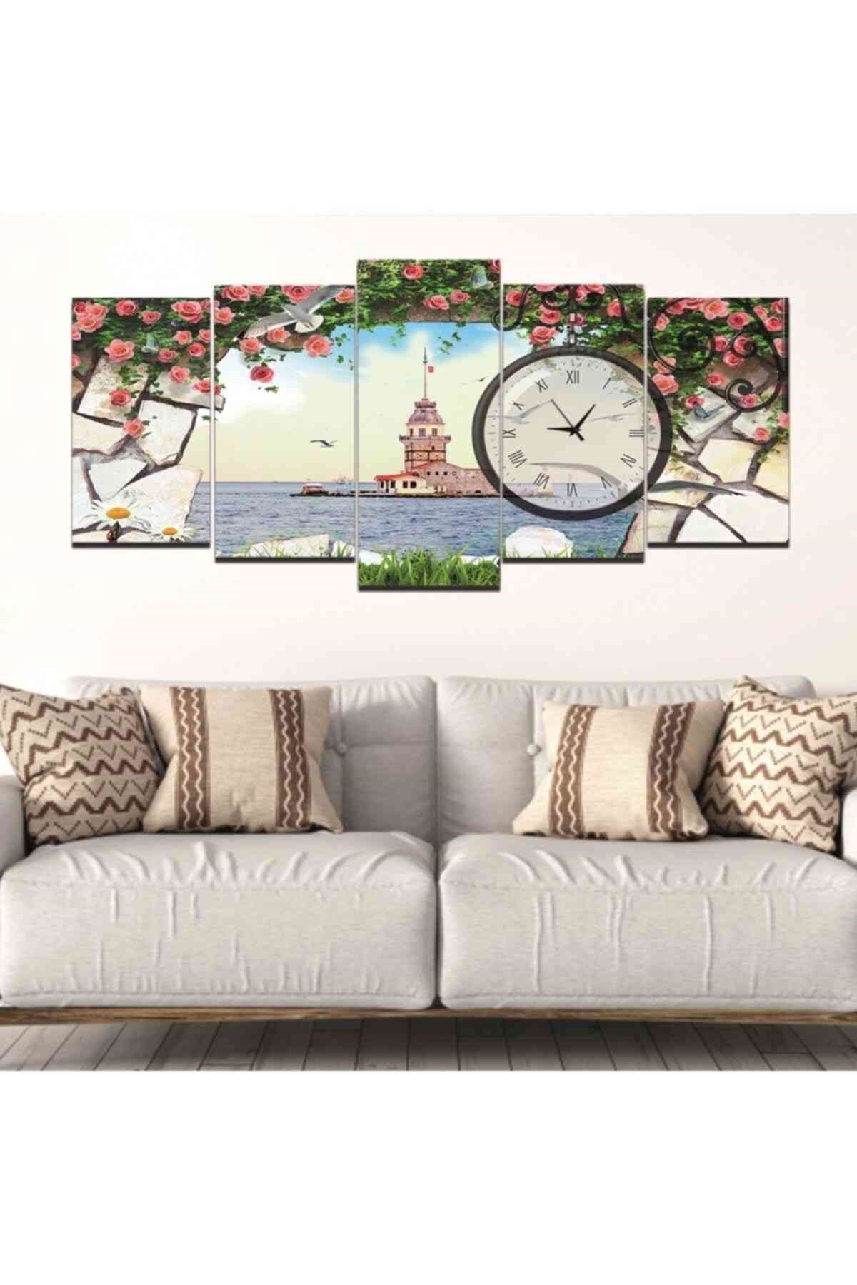 5 Parça Kız Kulesi Temalı Saatli Mdf Tablo