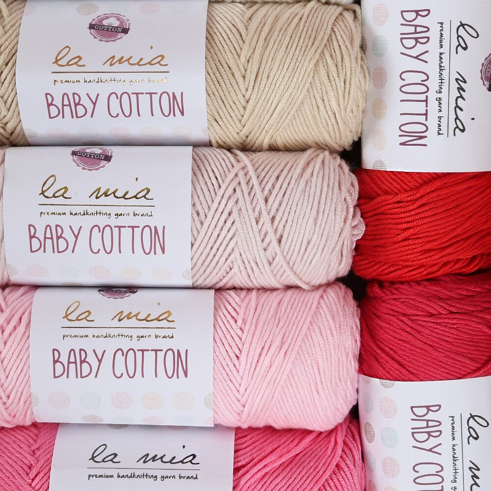 Hassas bebek ciltlerini tahrişe karşı koruyan, rahatlıkla ve güvenle kullanabileceğiniz La Mia Baby Cotton iplikleri %50 pamuk içeriğine sahiptir. La Mia Baby Cotton iplikleri, özenle seçilmiş pastel renk tonları ve yumuşak dokusu ile hem içinizi hem sizi ısıtacak.