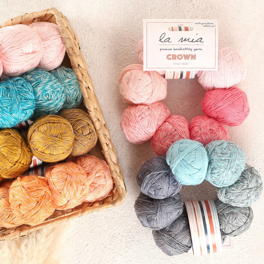 Create amazing designs with La Mia Crown yarns! With its 50% cotton and 50% acrylic, it gives your knits a different effect with its color flow. It comes in 8 mini balls of 25 gr, and you can create wonderful designs experimenting with this yarn.