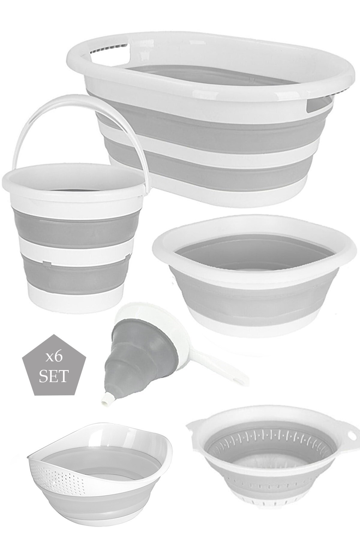 6'Lı Mega Katlanır Set Akordiyon Çamaşır Sepeti Su Kovası Badya Huni Süzgeç