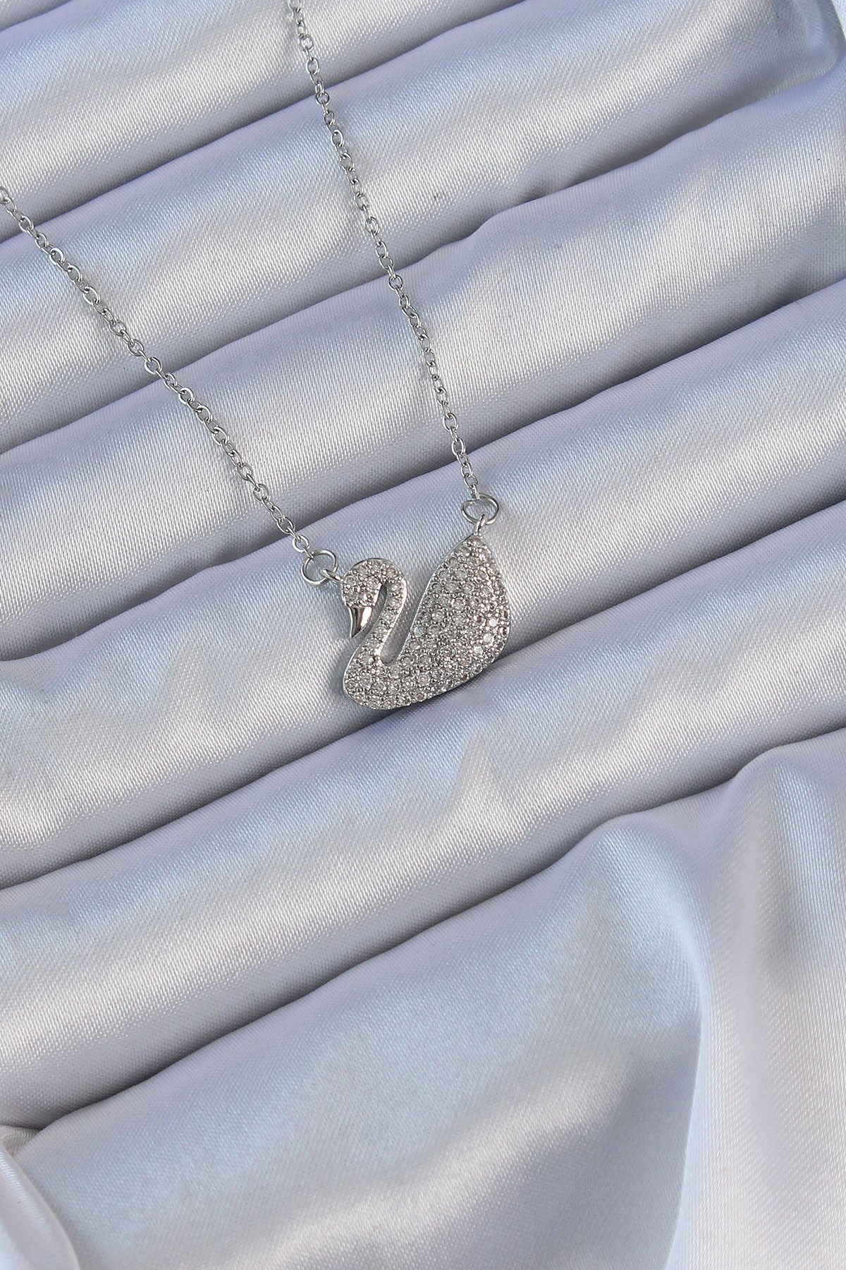 316L Çelik Zincir Gümüş Renk Zirkon Taşlı Kuğu Kolye