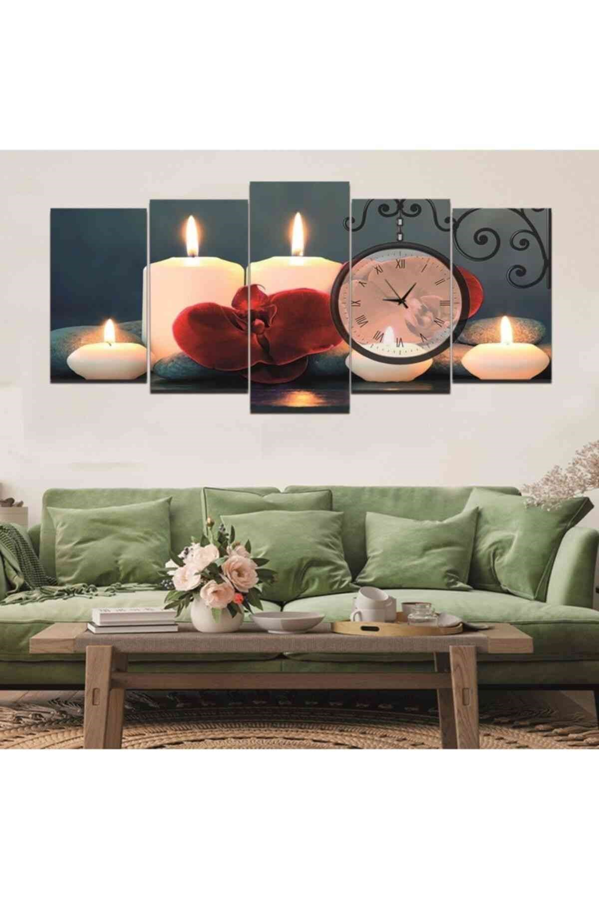 5 Parça Gül Ve Mum Temalı Saatli Mdf Tablo