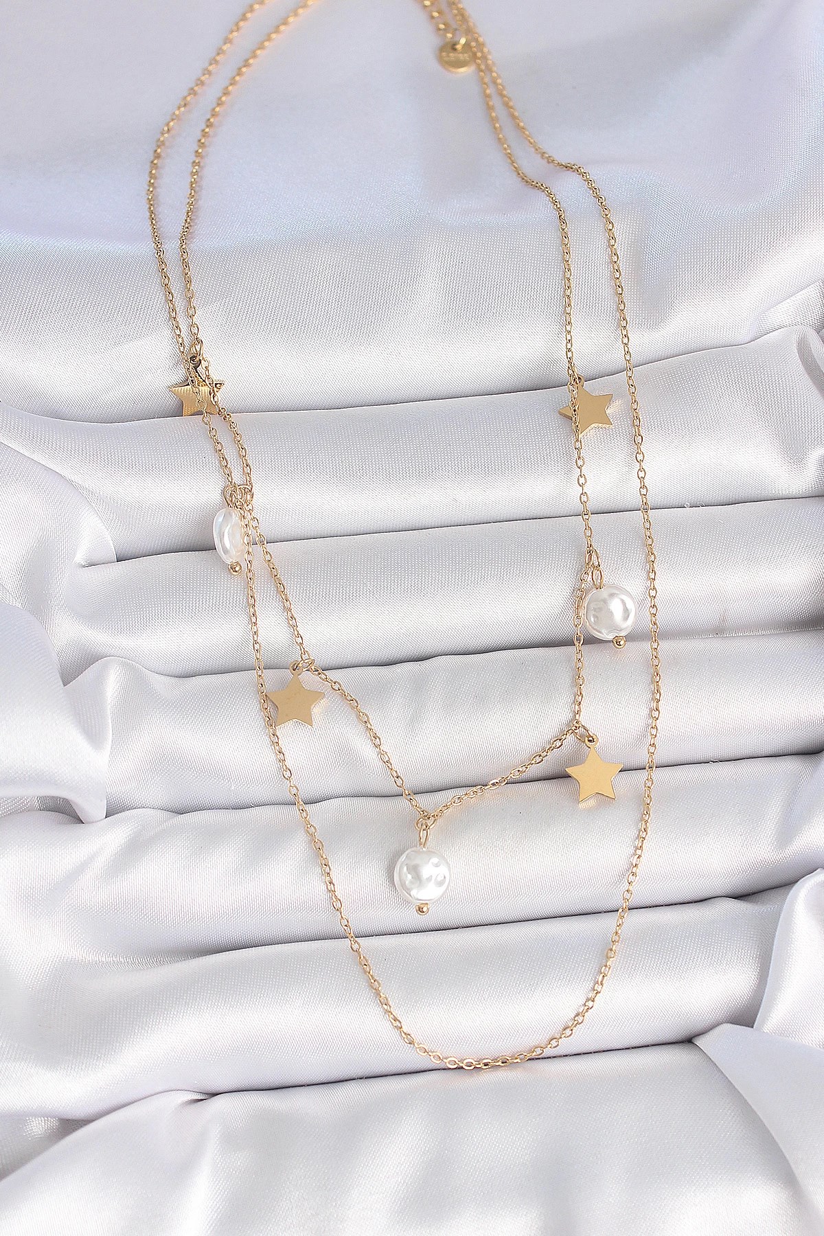 Mey İthalat® 316L Çelik Gold Renk 2'Li Zincir Sallantı Yıldız İnci Model Kadın Kolye