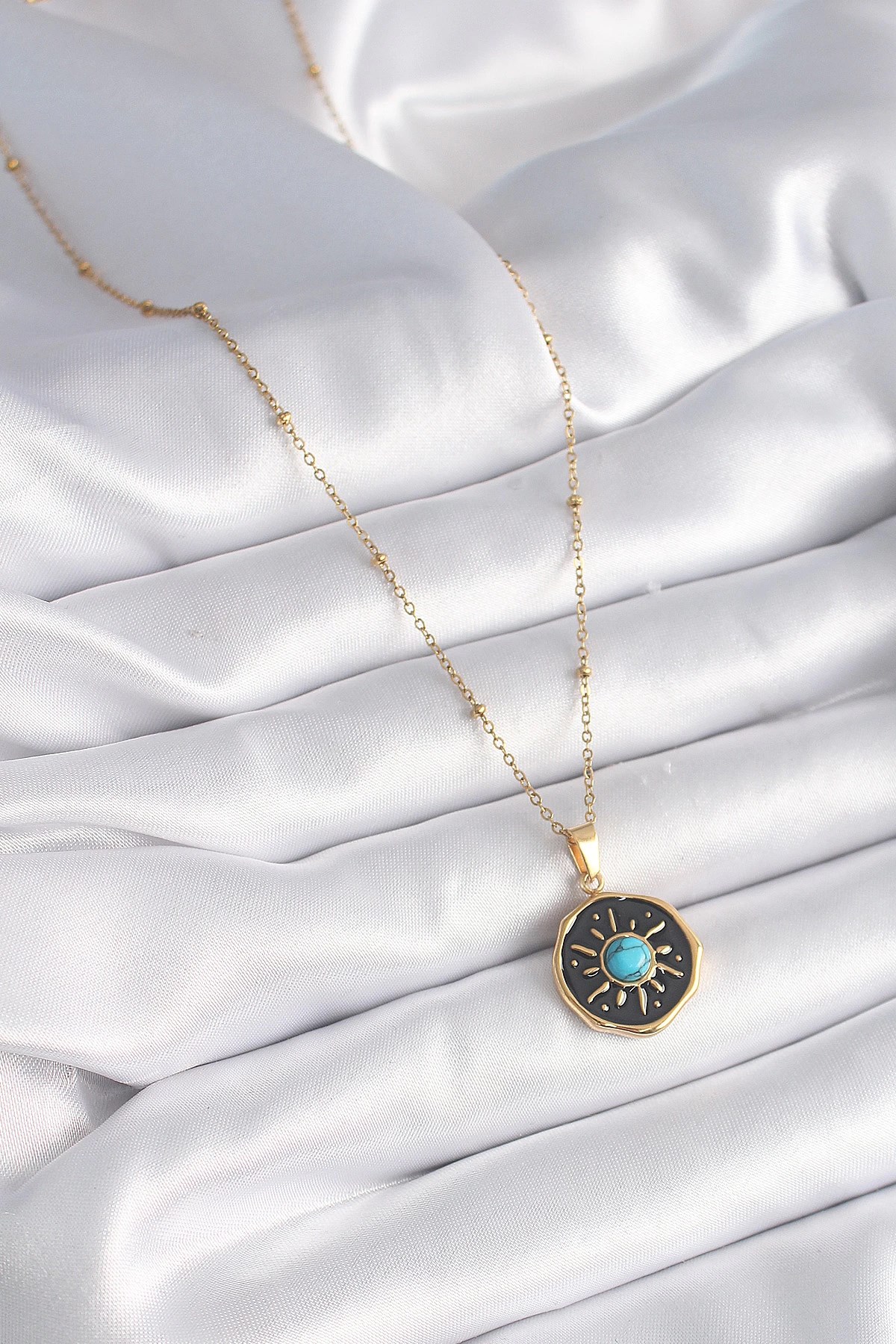 Mey İthalat® 316L Çelik Gold Renk Mavi Boncuk Güneş İşleme Madalyon Model Kadın Kolye