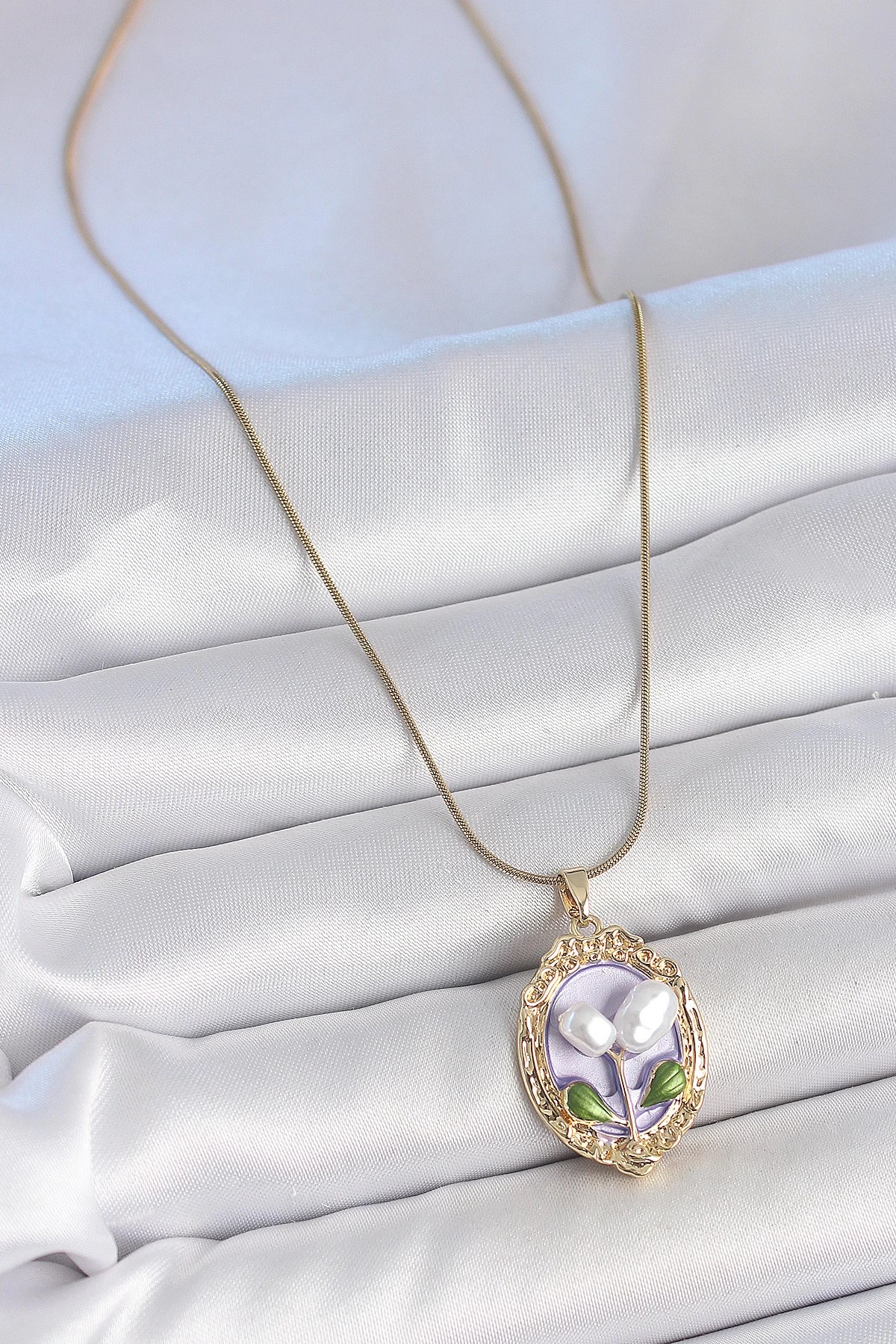 Mey İthalat® 316L Çelik Gold Renk Mor İncili Çiçek İşlemeli Portre Model Kadın Kolye