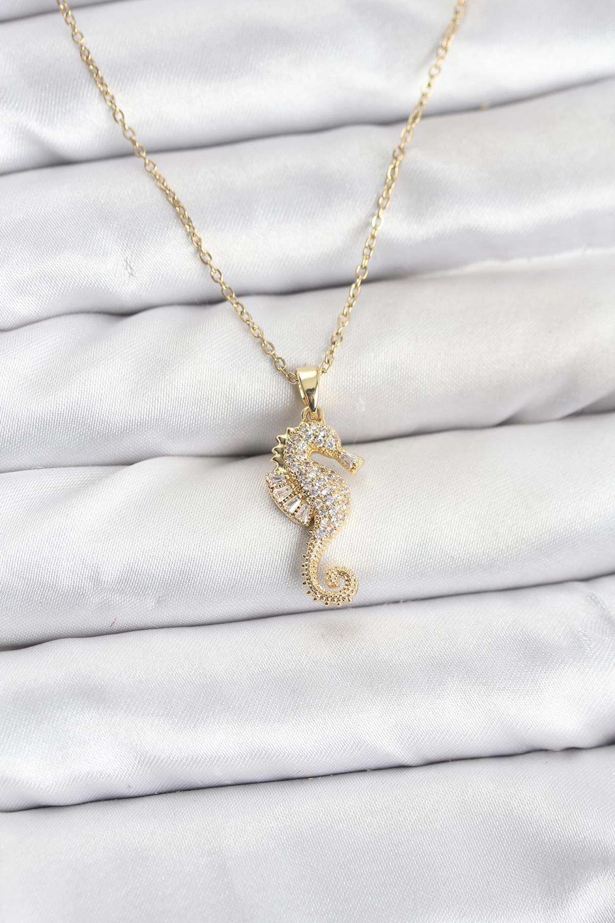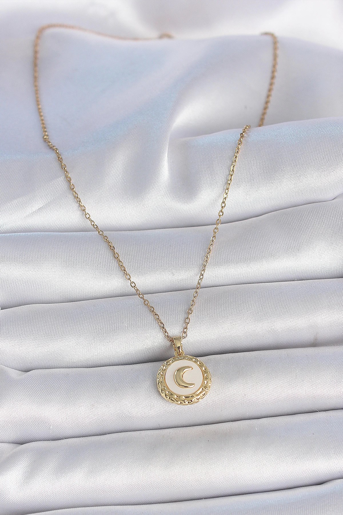 Mey İthalat® 316L Çelik Gold Renk Zincir Beyaz Mineli Hilal İşlemeli Madalyon Model Kadın Kolye