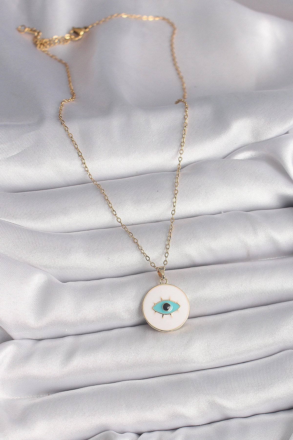 Mey İthalat® 316L Çelik Gold Renk Zincir Beyaz Mineli Turkuaz Göz İşleme Model Kadın Kolye