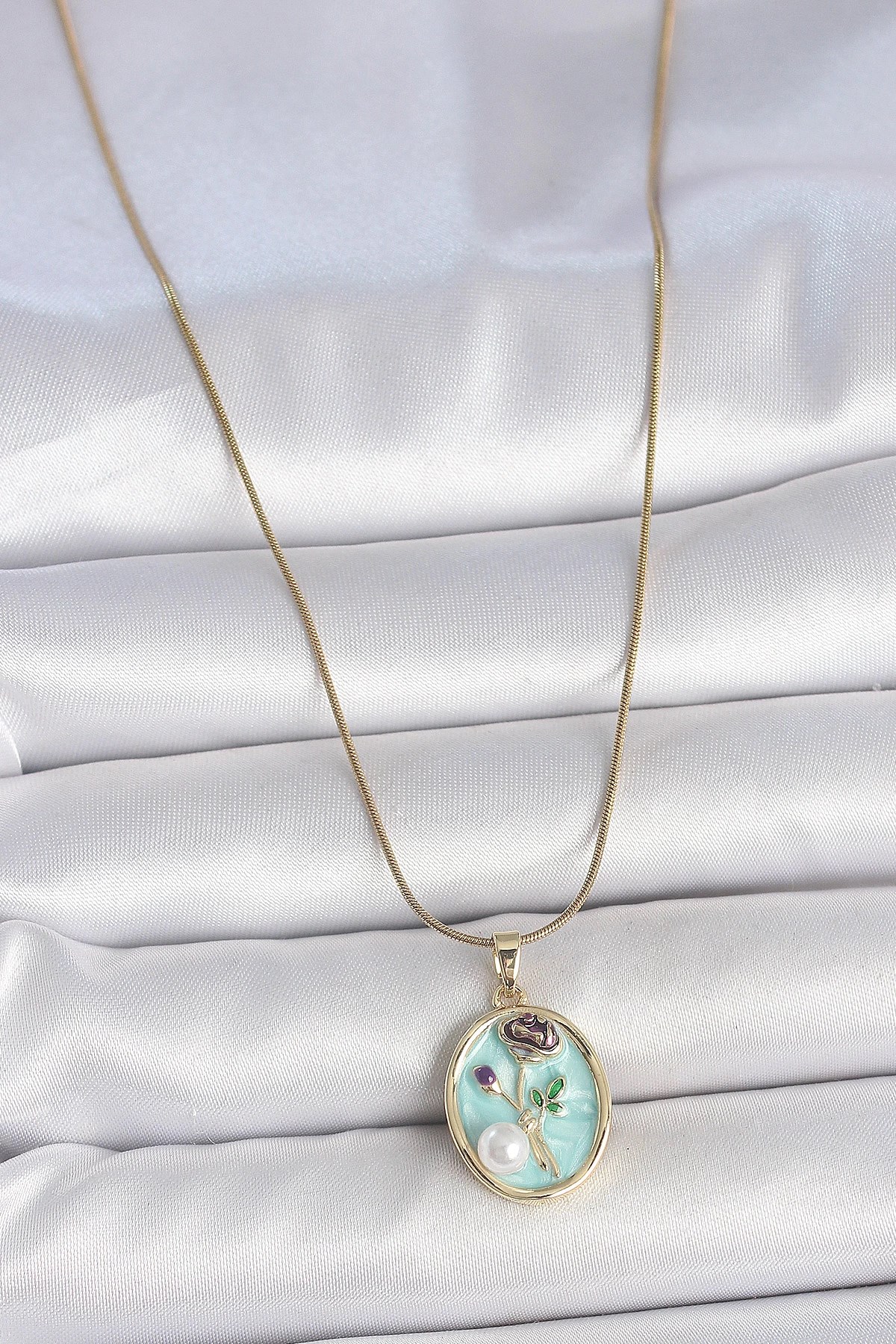 Mey İthalat® 316L Çelik Gold Renk Zincir Mavi Çiçek İşlemeli İnci Detay Portre Model Kadın Kolye