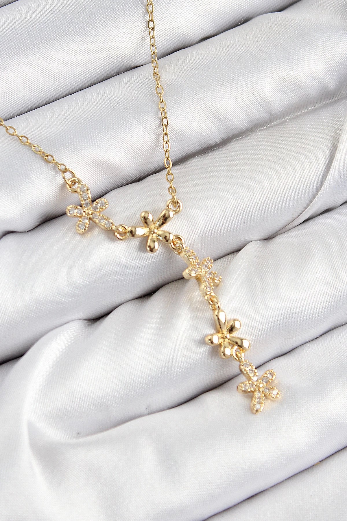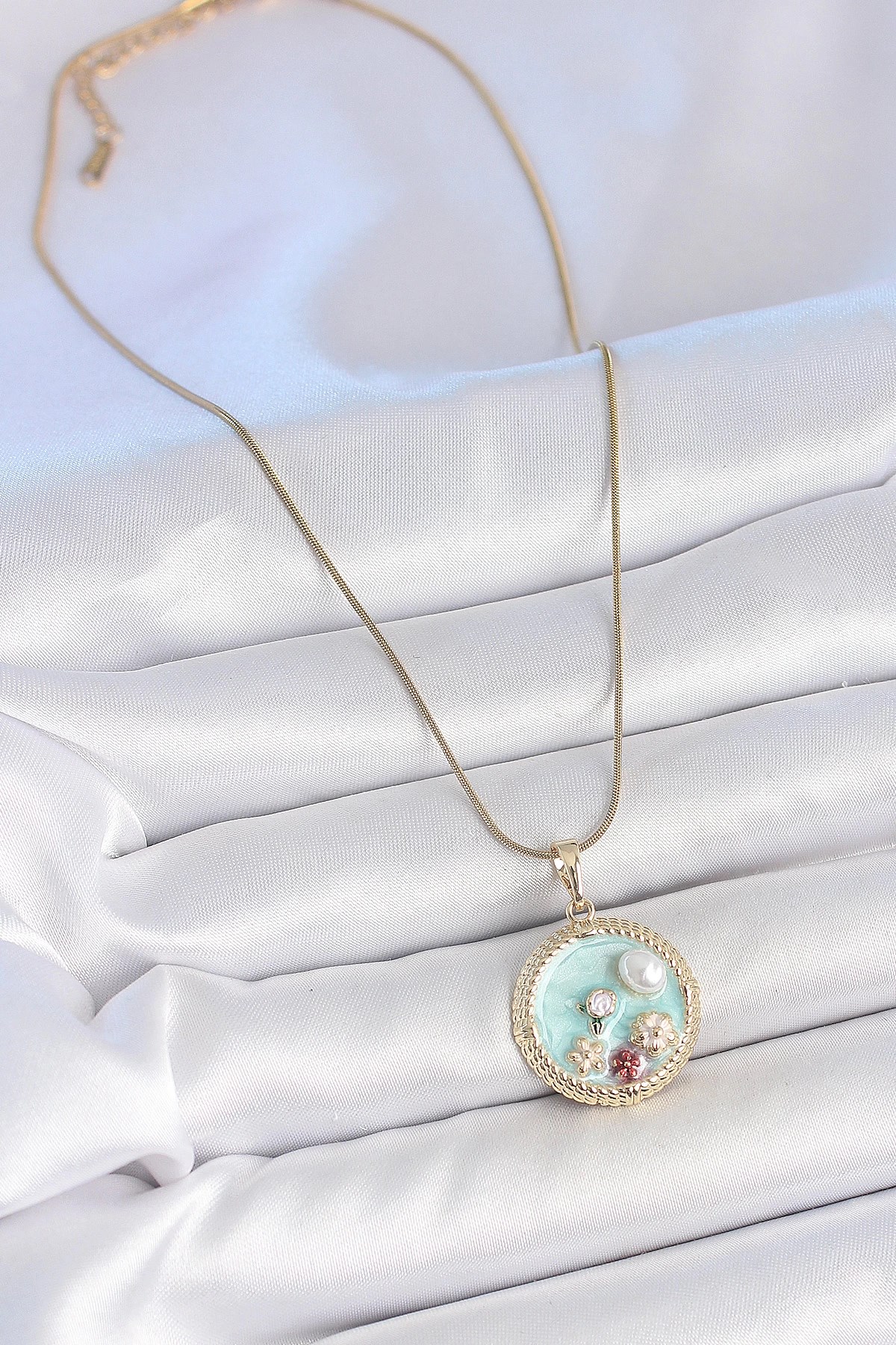 Mey İthalat® 316L Çelik Gold Renk Zincir Mavi Mineli İnci Çiçek İşlemeli Zirkon Taş Detaylı Madalyon Model Kadın Kolye