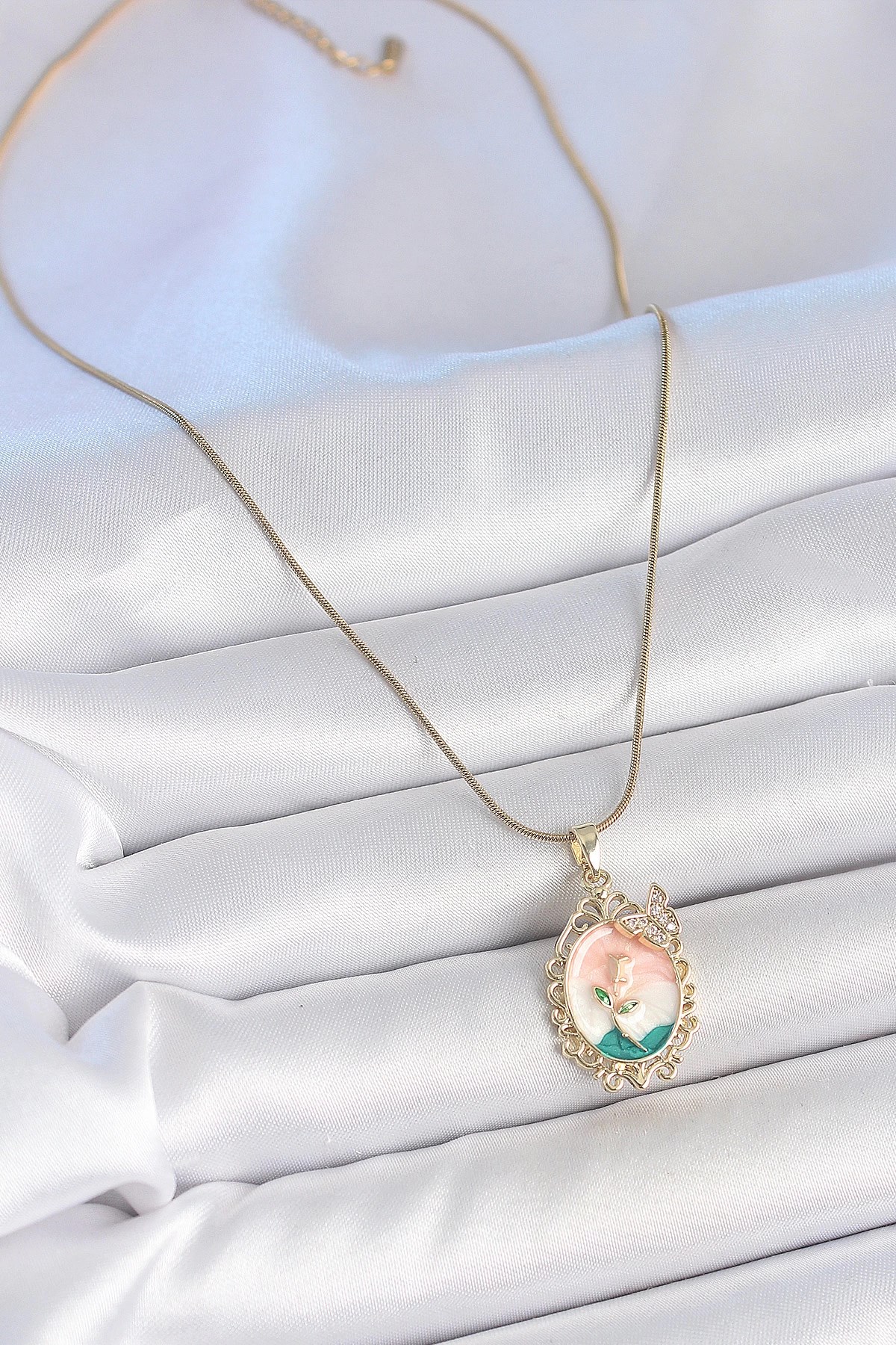 Mey İthalat® 316L Çelik Gold Renk Zincir Mix Renk Çiçek İşlemeli Zirkon Taş Detaylı Portre Model Kadın Kolye