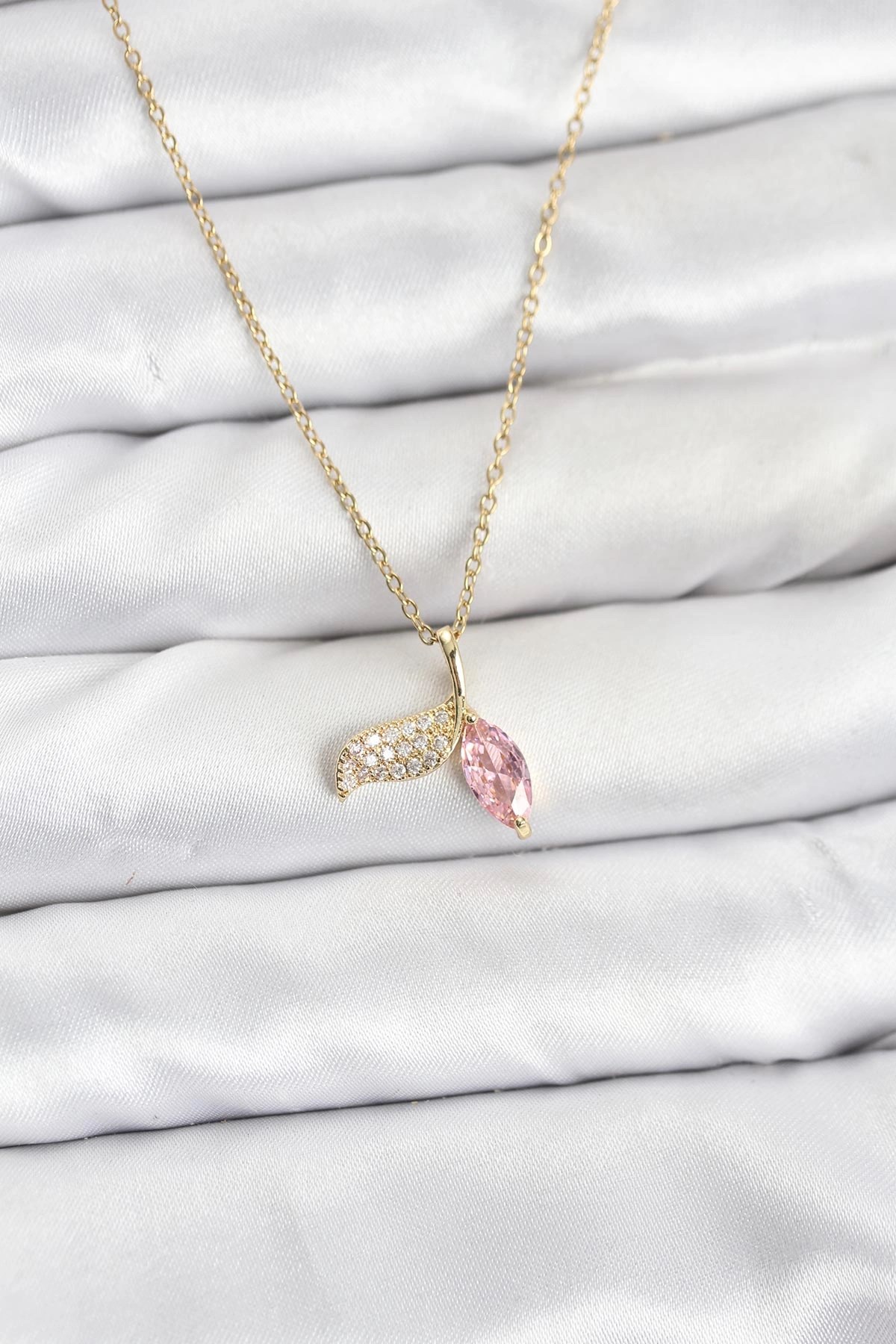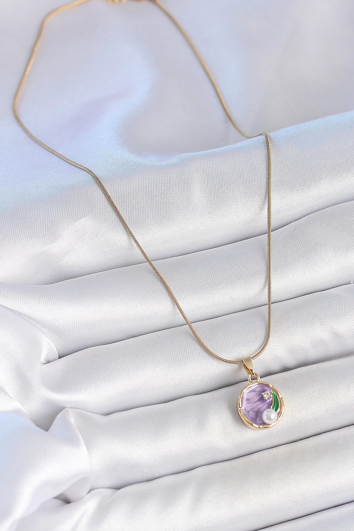 Mey İthalat® 316L Çelik Gold Renk Zincir Mor Çiçek İşlemeli Zirkon Taş İnci Detaylı Minimal Portre Model Kadın Kolye