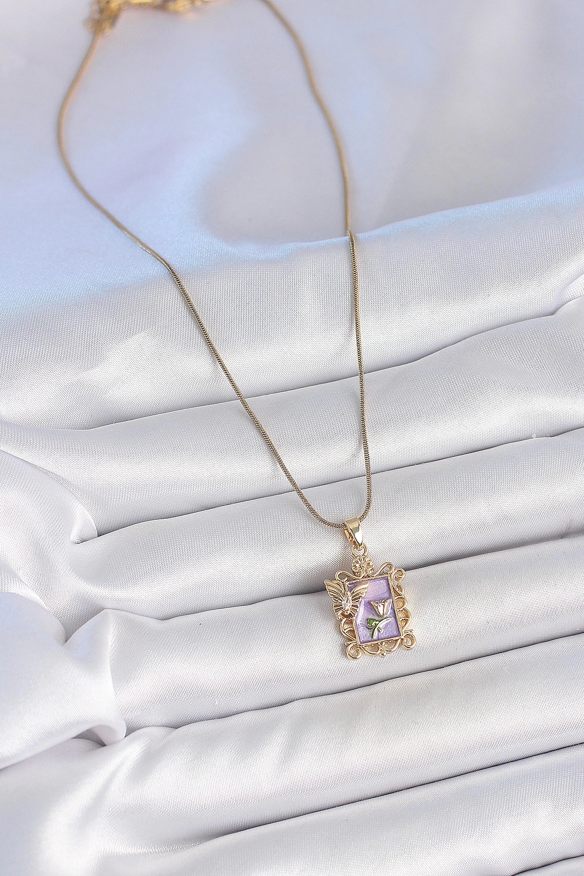 Mey İthalat® 316L Çelik Gold Renk Zincir Mor Mineli Çiçek İşlemeli Zirkon Taşlı Kelebek Detay Portre Model Kadın Kolye