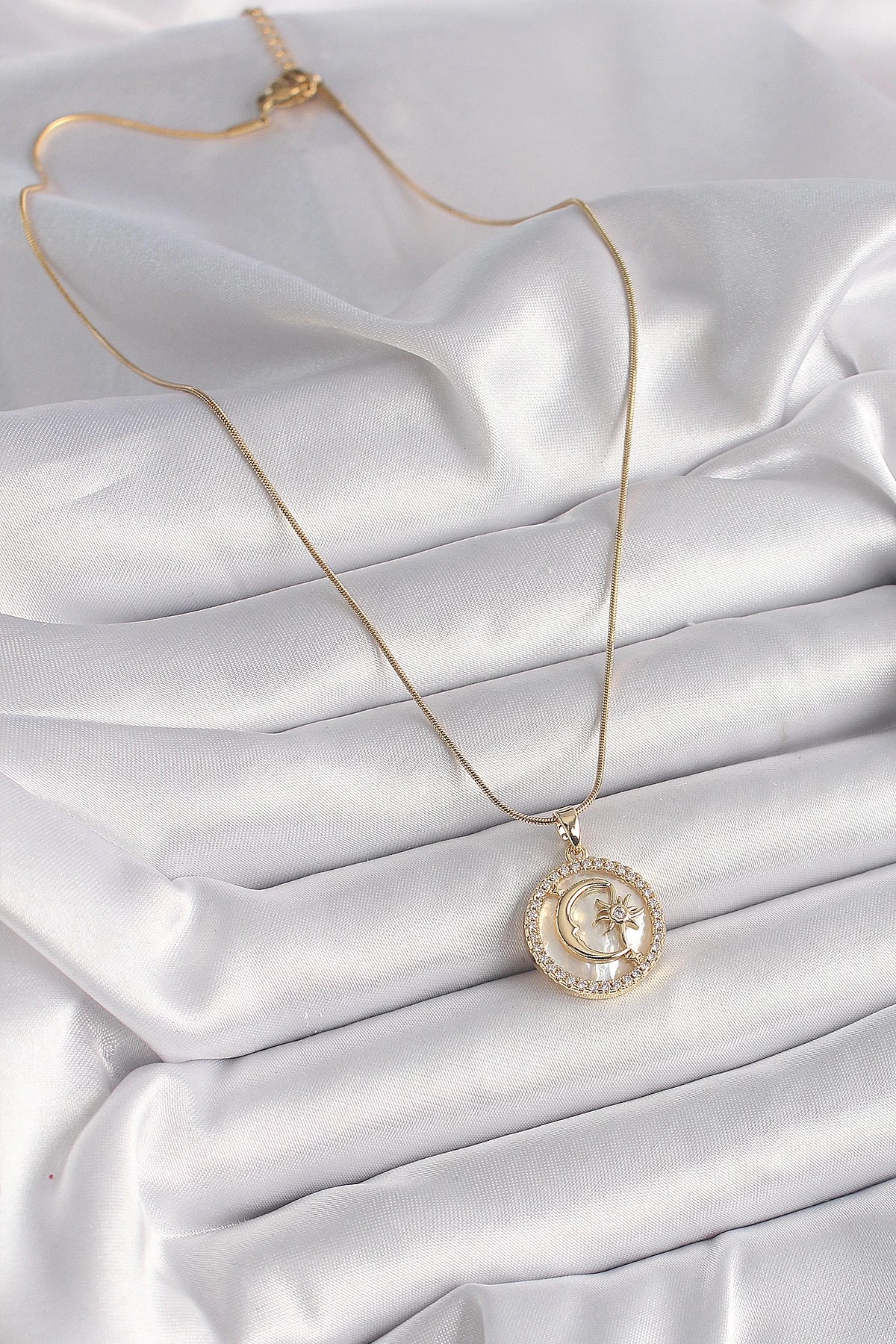 Mey İthalat® 316L Çelik Gold Renk Zincir Zirkon Taş Detaylı Beyaz Sedefli Ay Yıldız Model Kadın Kolye