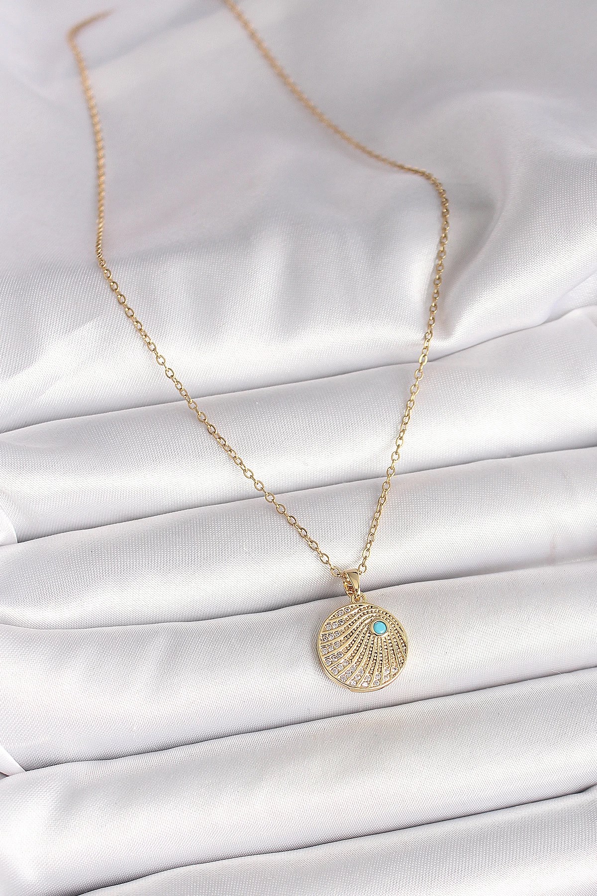 Mey İthalat® 316L Çelik Gold Renk Zincir Zirkon Taş İşlemeli Mavi Taş Detaylı Madalyon Model Kadın Kolye