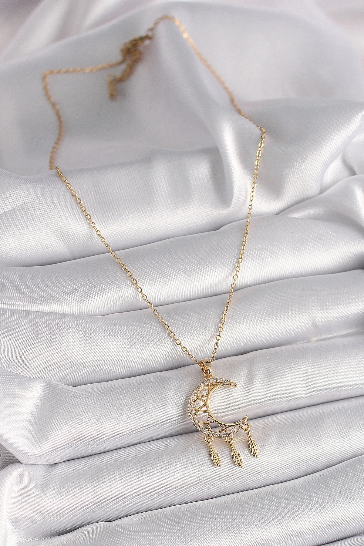 Mey İthalat® 316L Çelik Gold Renk Zincir Zirkon Taşlı Hilal Model Sallantı Yaprak Detay Kadın Kolye