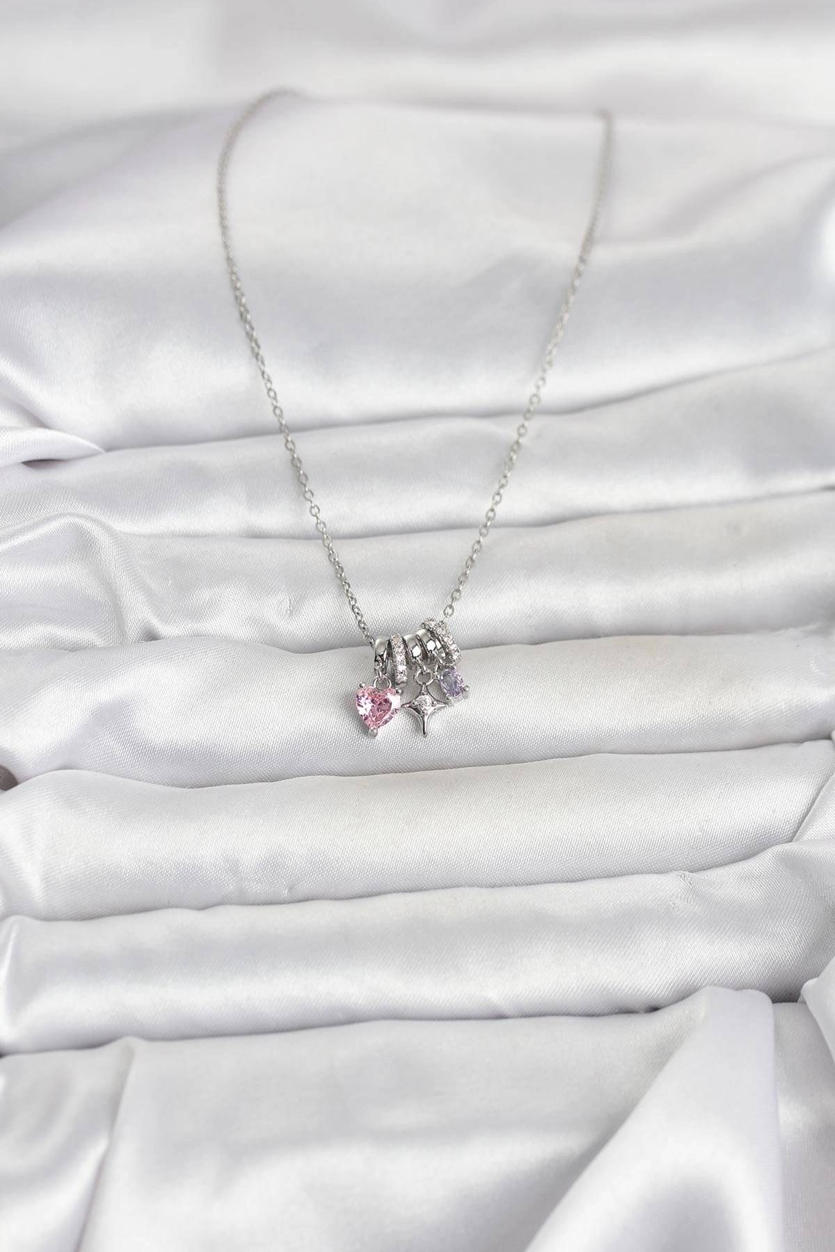 Mey İthalat® 316L Çelik Gümüş Pembe Zirkon Taşlı Charmlı Kadın Kolye