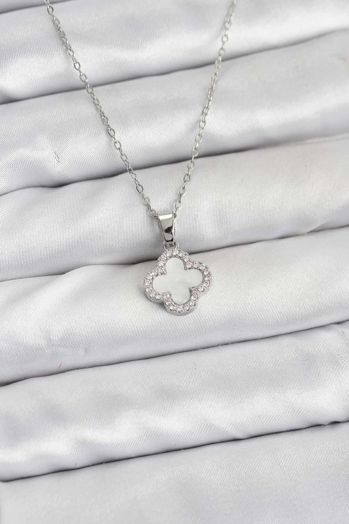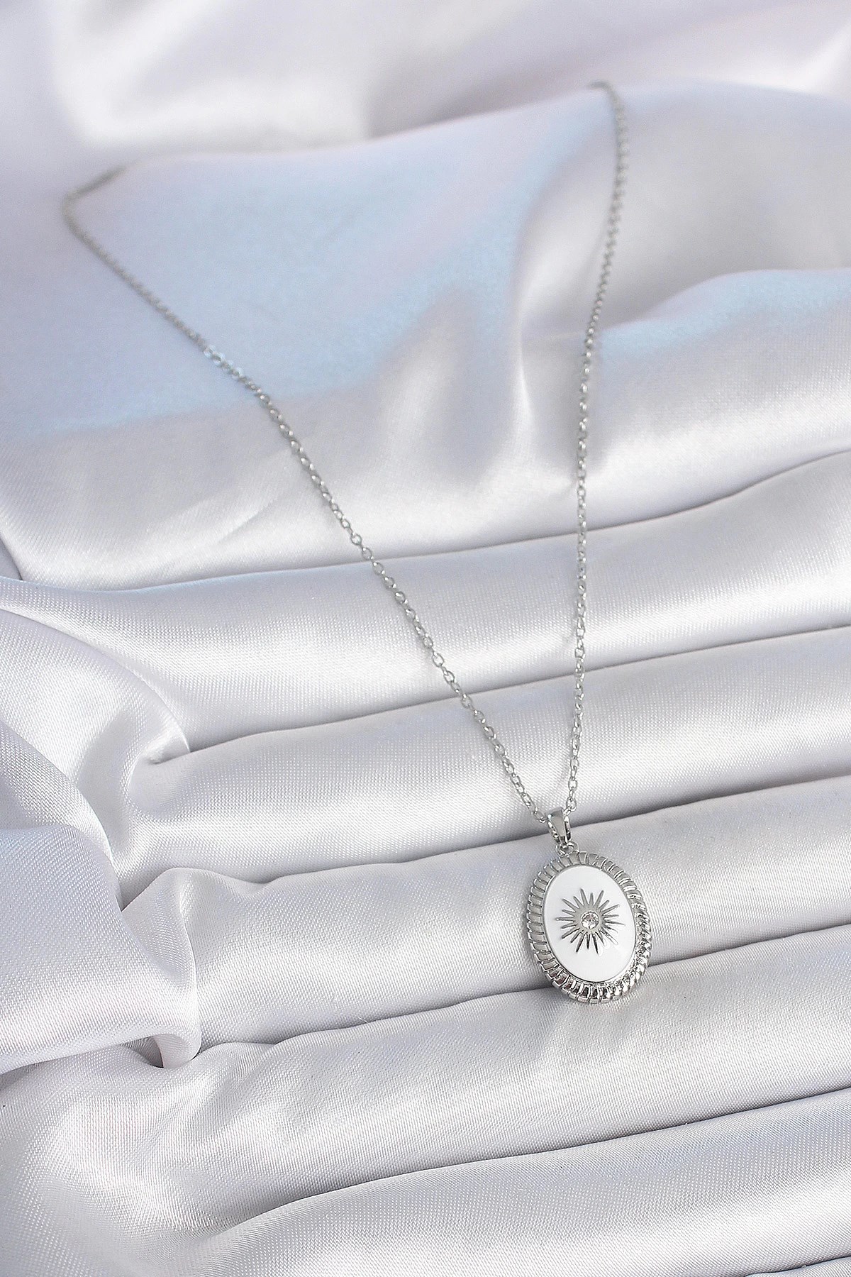 Mey İthalat® 316L Çelik Gümüş Renk Beyaz Mineli Güneş İşlemeli Nazar Boncuk Detay Madalyon Model Kadın Kolye