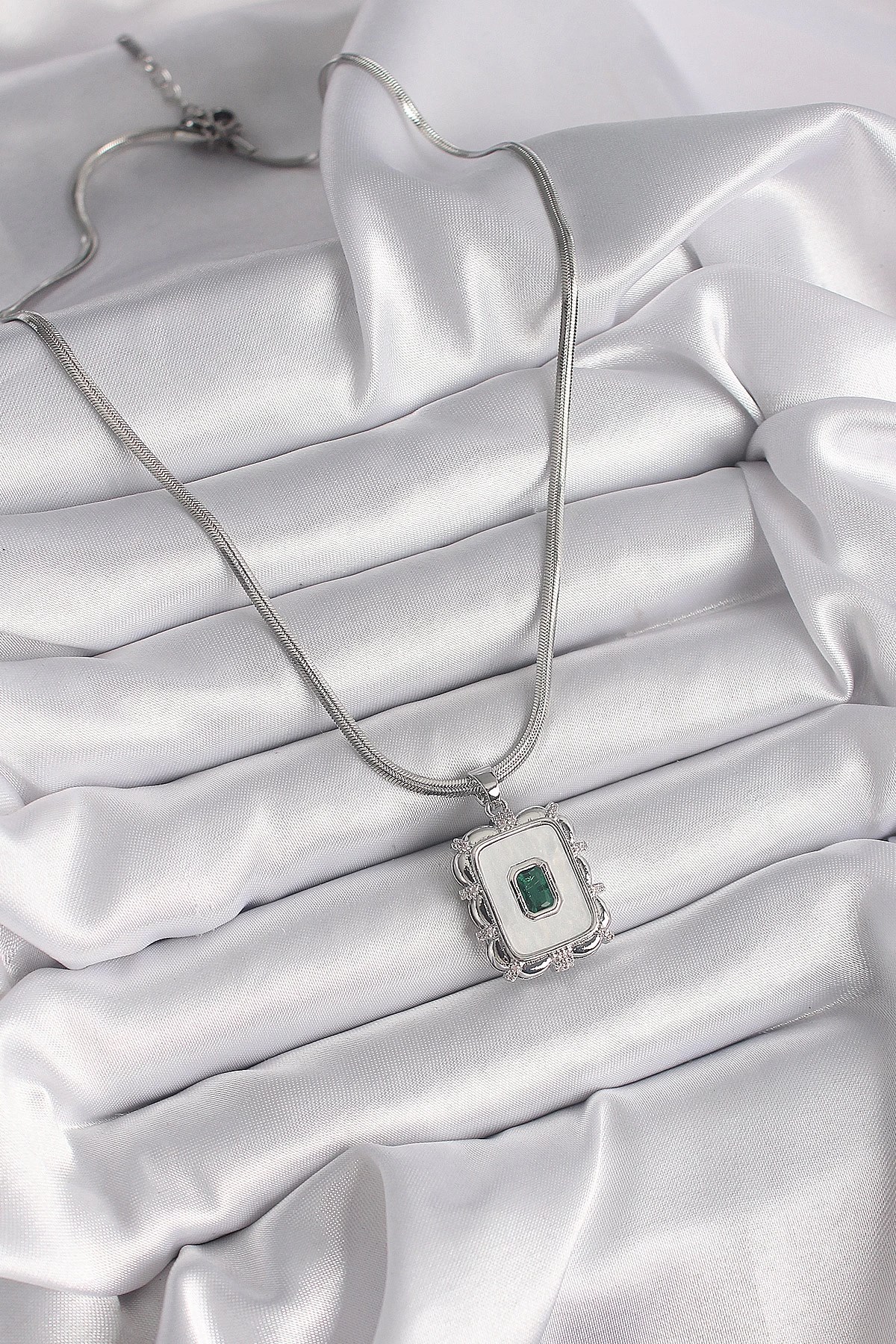Mey İthalat® 316L Çelik Gümüş Renk İtalyan Zincir Beyaz Sedefli Kare Portre Model Zümrüt Taş Detay Kadın Kolye