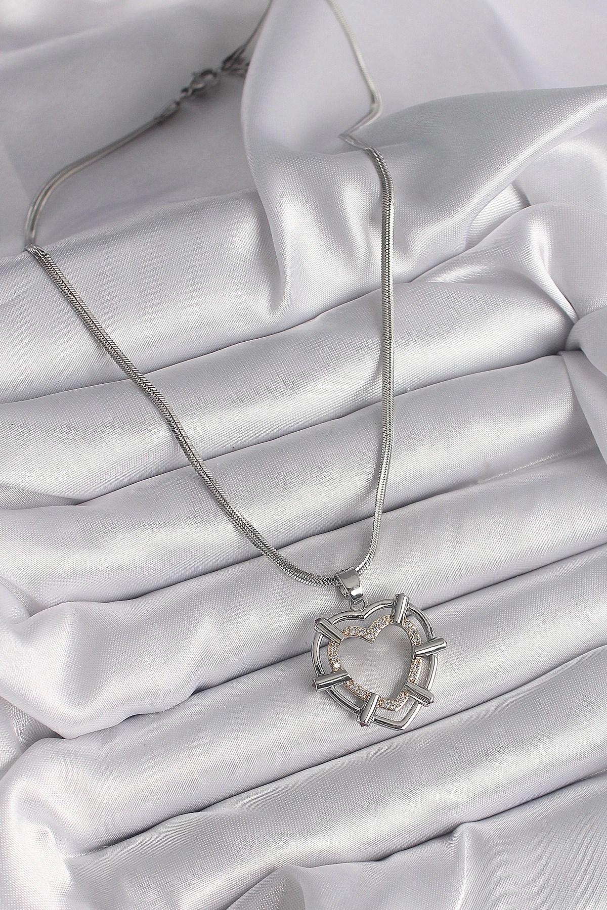 Mey İthalat® 316L Çelik Gümüş Renk İtalyan Zincir Mix Renk Zirkon Taş Detay Kalp Model Kadın Kolye