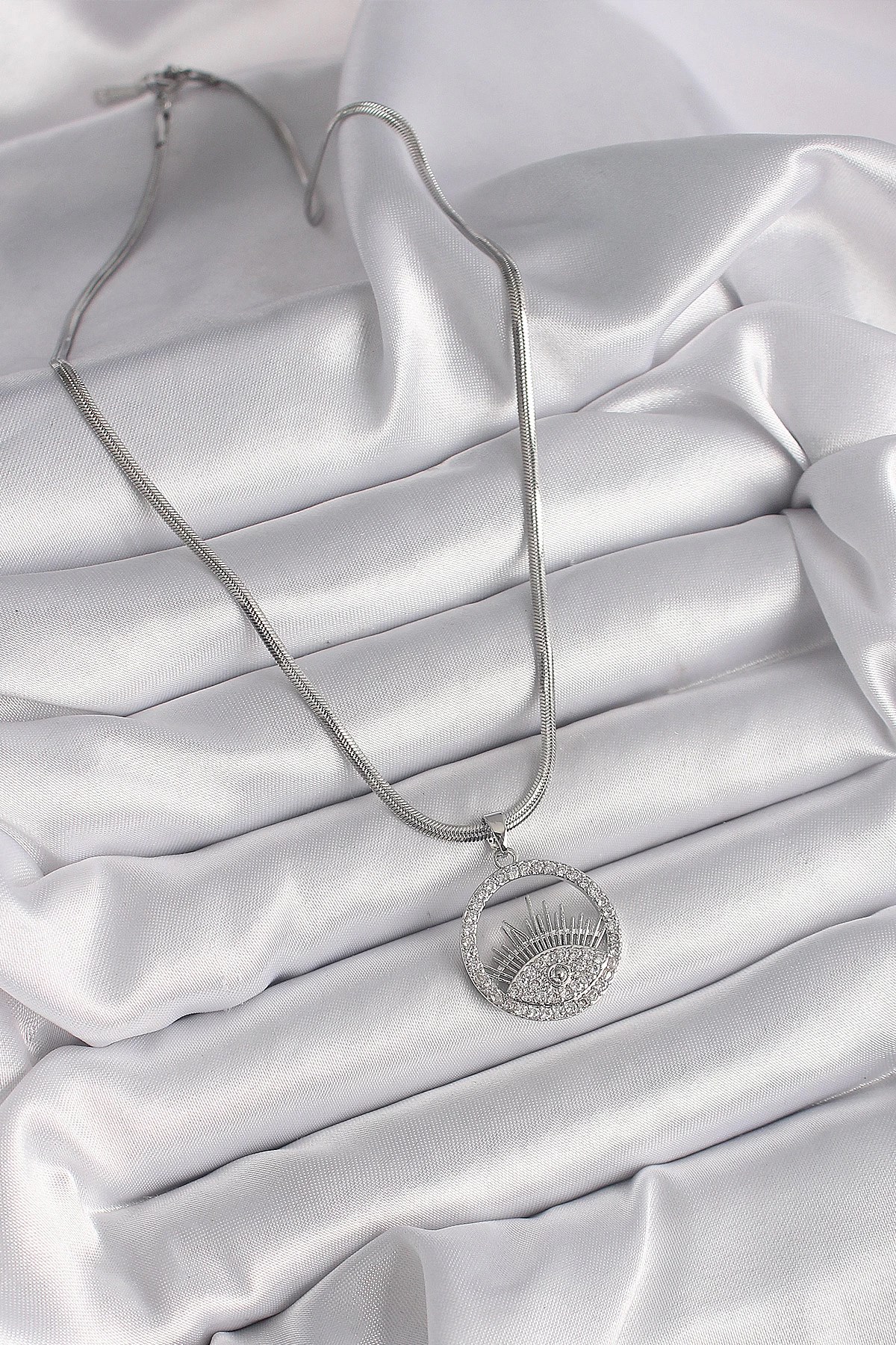 Mey İthalat® 316L Çelik Gümüş Renk İtalyan Zincir Zirkon Taşlı Göz Model Kadın Kolye