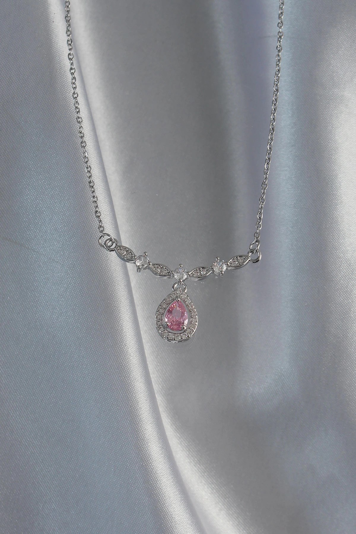 Mey İthalat® 316L Çelik Gümüş Renk Pembe Zirkon Taşlı Damla Kolye