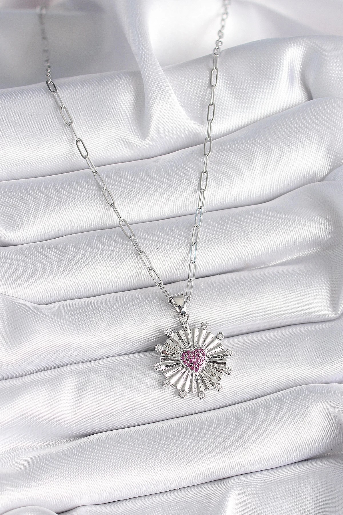Mey İthalat® 316L Çelik Gümüş Renk Pembe Zirkon Taşlı Kalp İşleme Madalyon Model Kadın Kolye