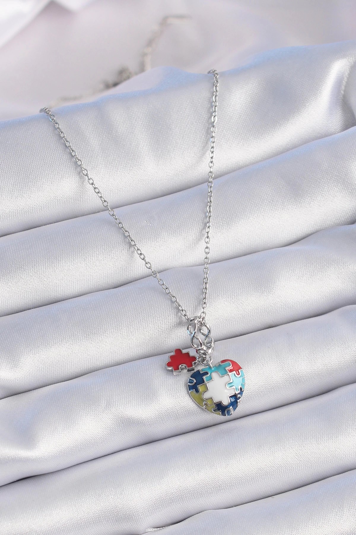 Mey İthalat® 316L Çelik Gümüş Renk Yapboz Motif Kalp Figür Charm Model Kadın Kolye