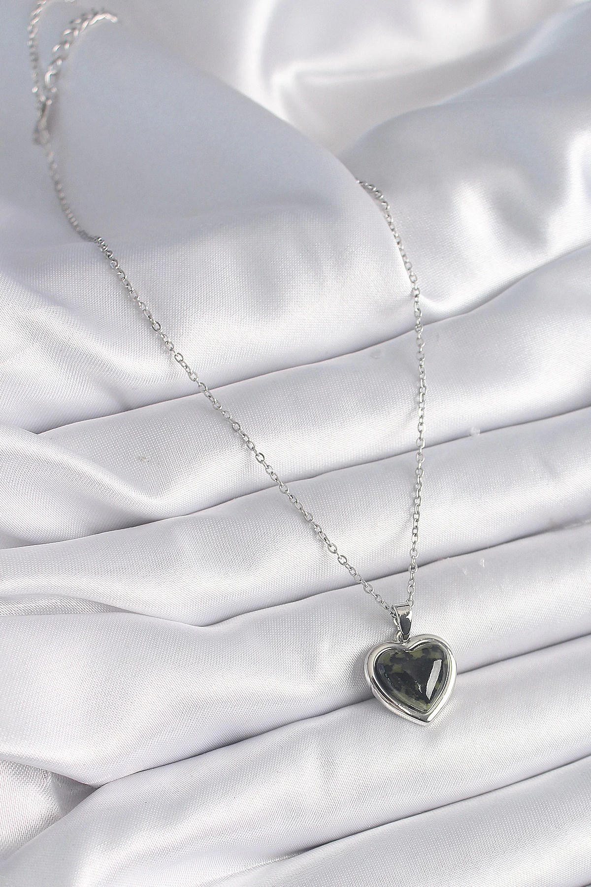 Mey İthalat® 316L Çelik Gümüş Renk Yeşil Mineli Kalp Model Kadın Kolye