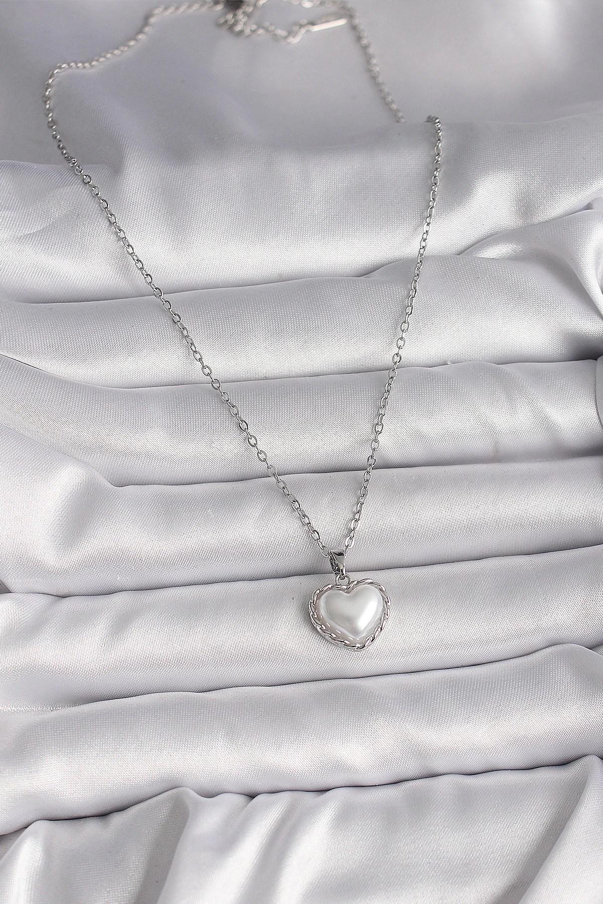 Mey İthalat® 316L Çelik Gümüş Renk Zincir 3D İnci Kalp Model Kadın Kolye