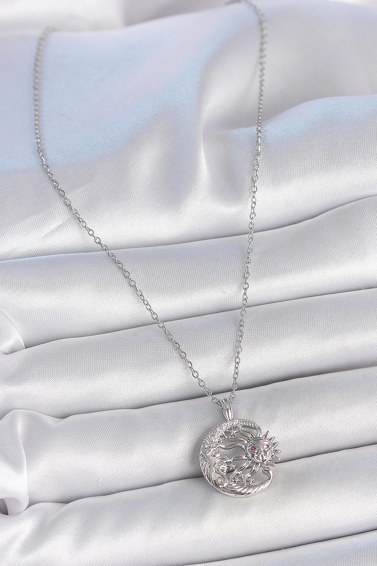 Mey İthalat® 316L Çelik Gümüş Renk Zincir Ay Güneş Model Zirkon Taş Detay Kadın Kolye